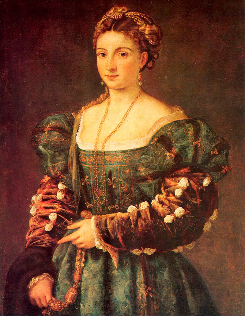 Au 16ème siècle, la mode de Venise a été fortement influencée par la mode de l'Espagne. Les robes des femmes sont de plus en plus fermées. Les manches sont fuselées, les bouffées ne restent que dans la zone des épaules. Sous l'influence de l'Espagne, les couleurs des vêtements deviennent également plus foncées. Les hommes commencent à porter de petites barbes, tandis qu'à Florence, les hommes se promenaient le visage rasé.