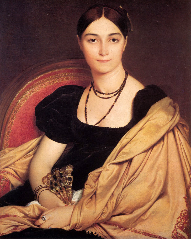 Portrait de Madame LeBlanc, 1823Un tissu blanc et léger, souvent en soie, une robe de style Empire à la dernière mode de l'époque était souvent porté humide de sorte que le tissu épouse la silhouette et, ainsi, la figure féminine ressemble aux colonnes de marbre blanc des temples antiques.
