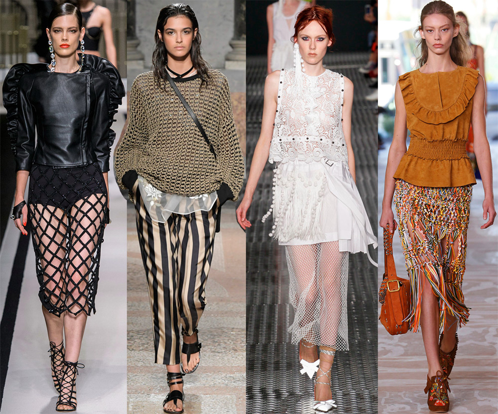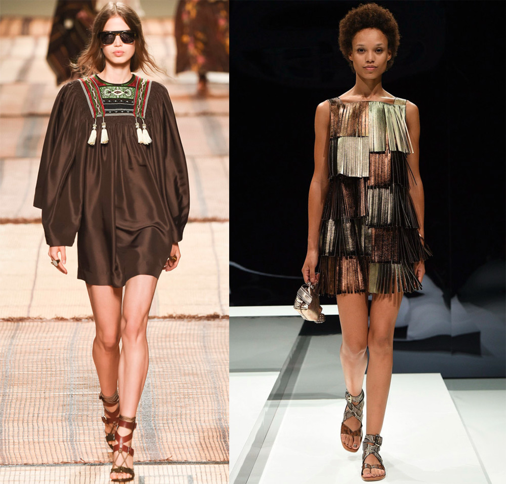 Philipp Plein, Jeremy Scott, Prabal Gurung, RodarteLa frange crée un effet de mouvement, quelque chose de flottant et de fluide. Il s'est avéré approprié partout, y compris les accessoires. La frange la plus courante sous la forme de fines rayures sur les produits en cuir et en daim. Des franges en fils fins et des plumes ornent les robes de soirée courtes et longues.