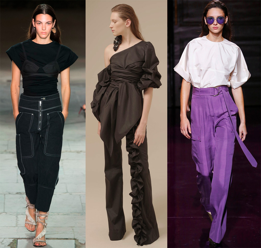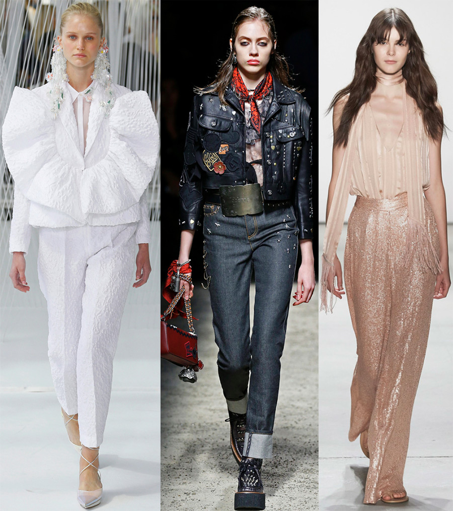 Ralph Lauren, Zuhair MuradLors du choix d'un tissu, il est nécessaire de prendre en compte sa densité, son motif et sa texture, car tout cela affecte également la silhouette du vêtement.Divers matériaux ont été utilisés dans les collections de pantalons à la mode, notamment le crêpe-mousseline, le coton, le sergé, le denim, la gabardine et les tricots, le brocart, l'organza, les tissus métallisés et bien sûr le cuir.