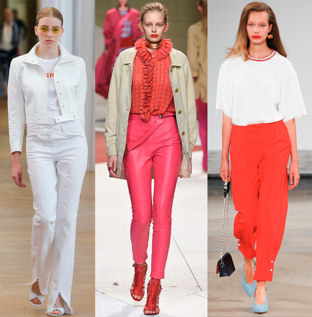 En plus des tissus légers et aérés, vous trouverez du cuir naturel lisse dans les collections de Trussardi, Topshop Unique, Emanuel Ungaro, Marissa Webb, Kenzo et de nombreuses autres marques de mode. Ce n'est qu'au printemps-été que le cuir coloré est préférable, et les pantalons à volants et autres détails, traditionnels pour cette saison. Bien que les pantalons en cuir noir restent populaires dans la nouvelle saison.