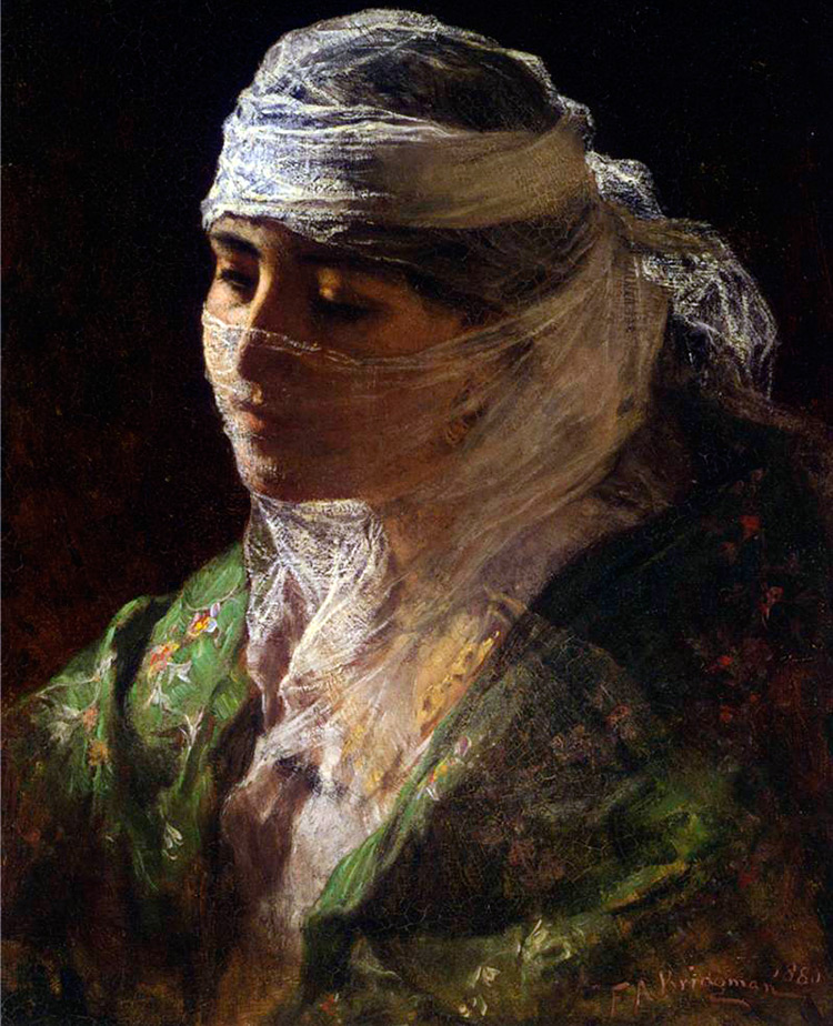 Frédéric Arthur Bridgeman (1847-1928)Dans le même temps, dans différentes parties de l'ancien califat arabe, le voile féminin finira par acquérir des caractéristiques locales et des noms différents. Ainsi, dans les pays du Moyen-Orient, le voile commencera à s'appeler la burqa, très probablement du mot persan ferenje, qui signifie "trou", "feuille de fenêtre". Un tel voile couvrait complètement la silhouette et ne laissait que pour le visage une sorte de "fenêtre" - une fenêtre sous la forme d'un tissu à mailles épaisses.