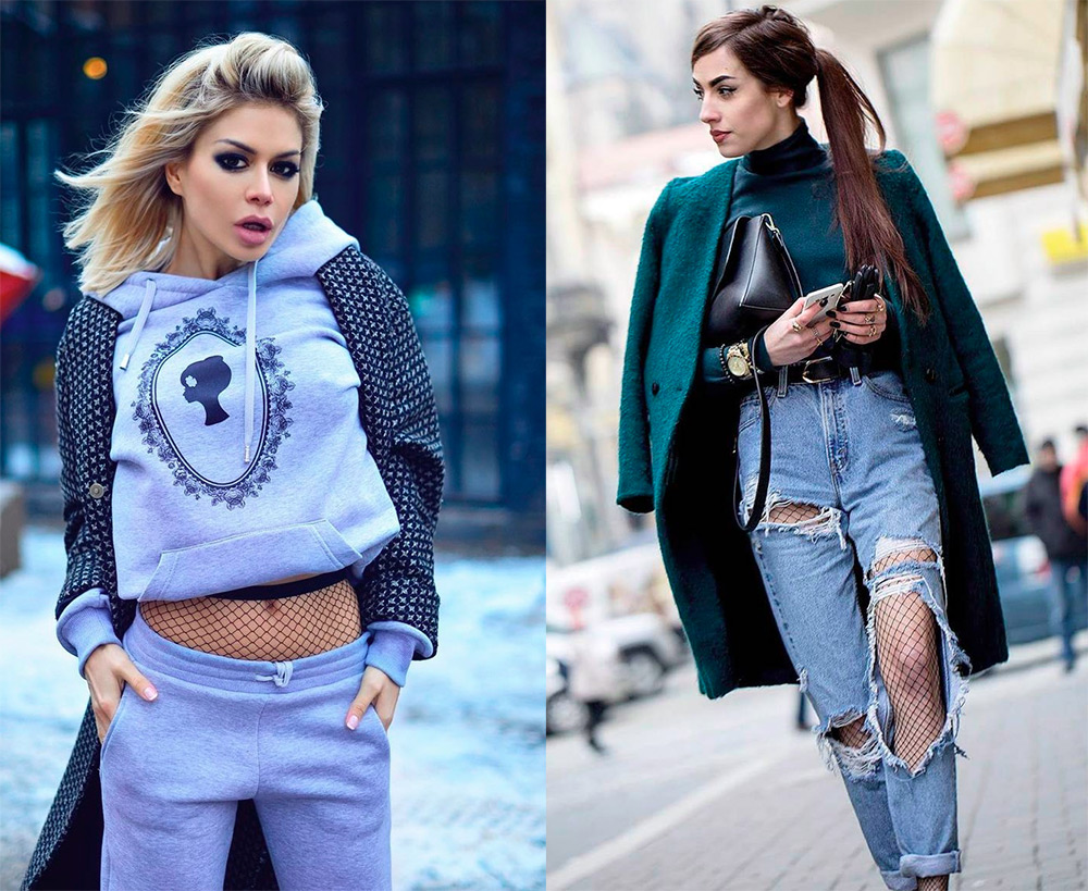 La maille va bien avec une robe ou une jupe crayon faite de tissus denses qui atteignent le genou. Les chaussures doivent être fermées. L'option idéale est un pantalon large ou un jean sous lequel des bas résille ressortent légèrement. Les ballerines conviennent à cet ensemble, qui supprime complètement les connotations érotiques.