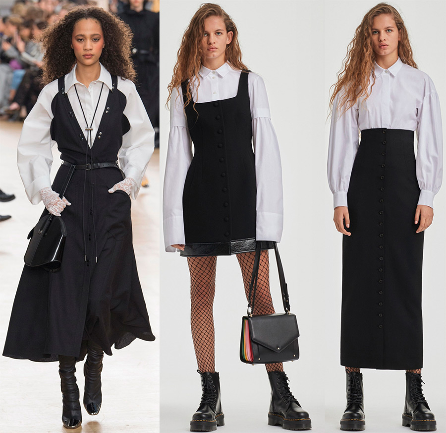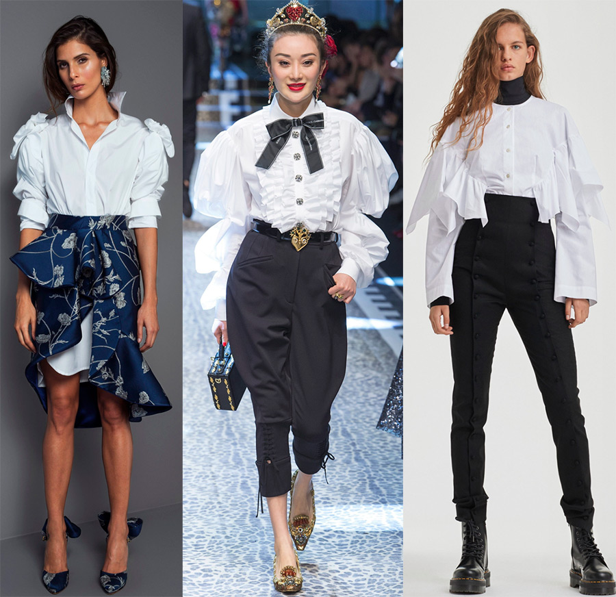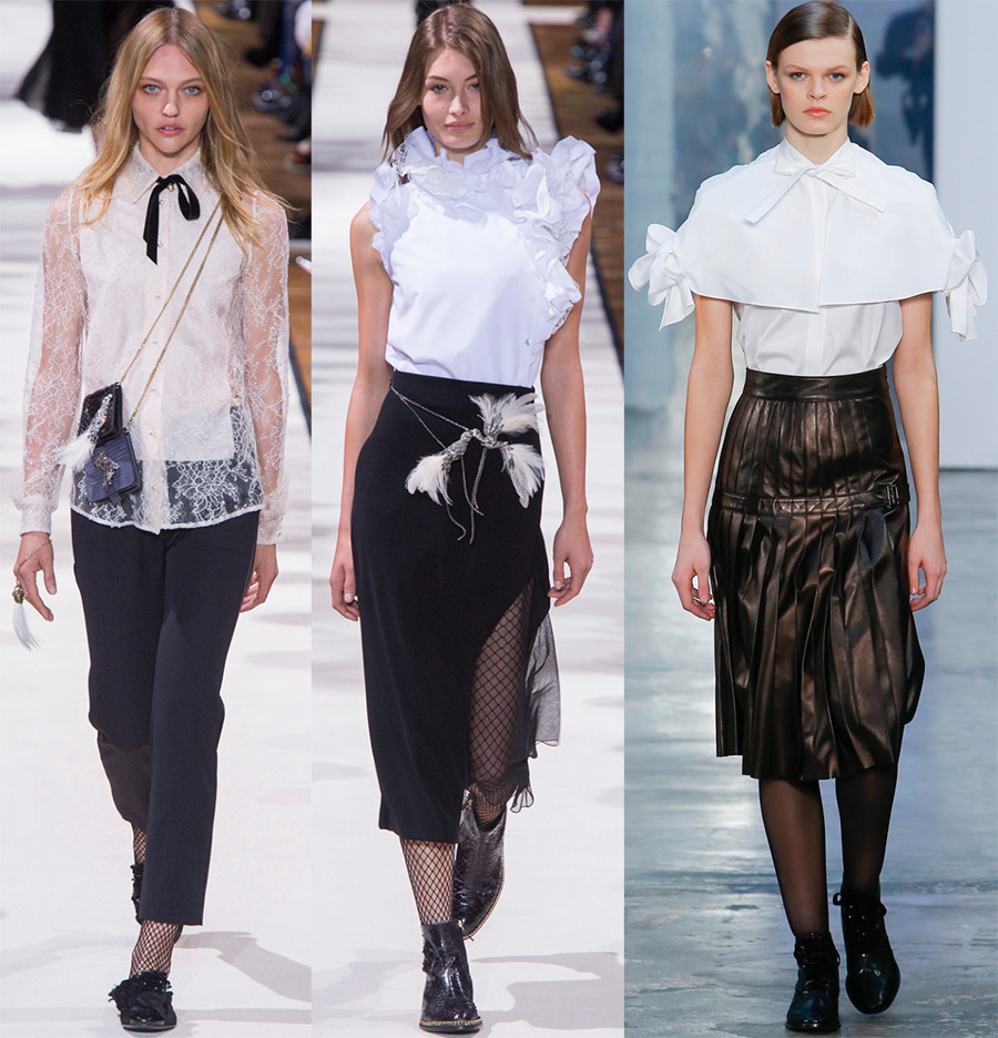 Isa Arfen, Jacquemus, Johanna OrtizLa décoration des blouses blanches conserve sa couleur blanche inchangée, car les volants, les volants, les nœuds et les nœuds, ainsi que les cravates, restent le plus souvent blancs, bien qu'un nœud noir ou une cravate noire intervienne parfois.