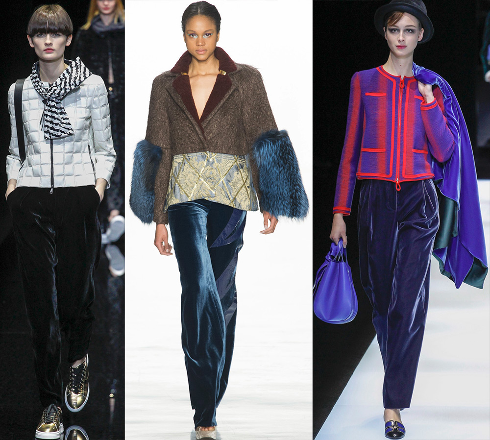 Escada, Lanvin, Max MaraLes créateurs choisissent des matières pour les pantalons, à la fois denses et légères. Parmi eux se trouvent la laine, la maille, le tweed, le cachemire, le satin, la soie, le velours, le cuir.