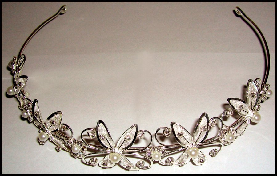 Diadème en forme de couronne en argent, agrémenté perles blanches ou strass, il se marie très bien avec une robe blanche ou avec une robe blanche brillante. Si la robe est d'une couleur différente, vous devez faire attention à la façon dont le diadème est décoré, à la couleur des pierres, des strass ou des fleurs. Et il est nécessaire de choisir un diadème en fonction de la palette de couleurs de toute la robe de mariée. Un diadème doré est également possible.