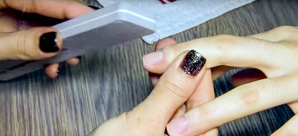 Le polissage initial de l'ongle permet de lisser les écailles de kératine, d'éliminer les micro-rayures formées après le meulage et toutes les irrégularités. Contrairement au ponçage, le polissage primaire est effectué dans le sens de la pousse de l'ongle. A ce stade, le polissage est effectué avec la lime à ongles la plus dure.