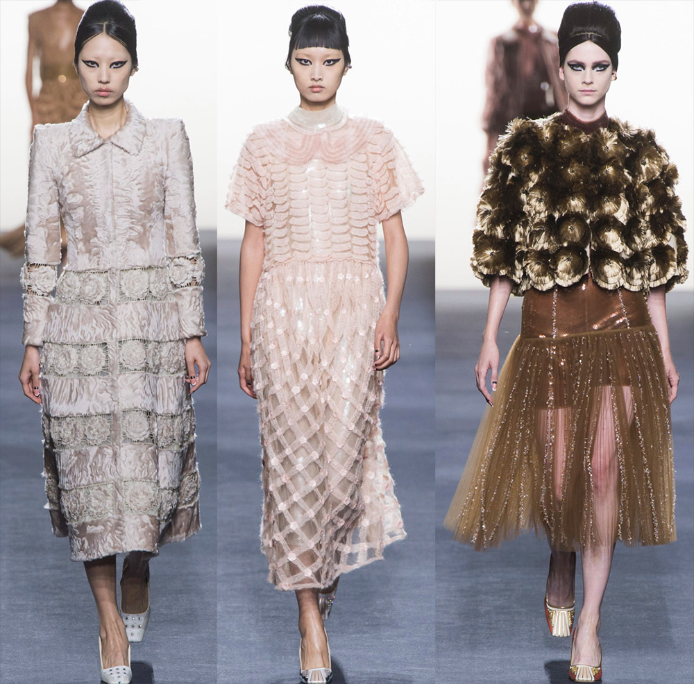 Dans certaines choses, on utilise de la fourrure de mouton, mais elle a subi un tel traitement que même en essayant un manteau de fourrure, on pourrait penser qu'il est fait de fourrure de vison ! Dans d'autres tenues, l'organza remplace le cuir et le daim. Et où l'on voit de la fourrure naturelle, en fait du velours. Toute la collection est basée sur des combinaisons et des illusions inhabituelles. Comment