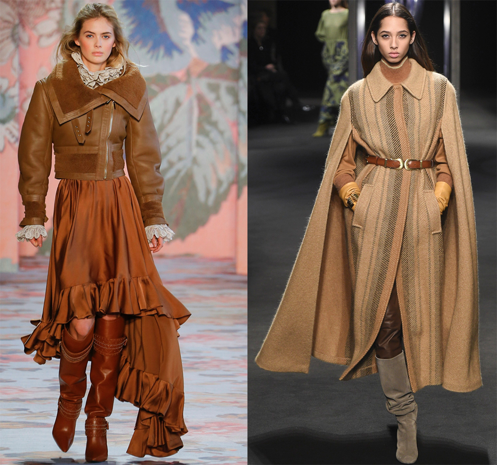 Les concepteurs sont invités à privilégier les matériaux naturels. Des ponchos chauds aux motifs ethniques, des vestes en daim ou en cuir, de grandes écharpes autour du cou ou une large écharpe auront fière allure dans le froid glacial. Un sac à franges et un chapeau en feutre peuvent compléter le look.