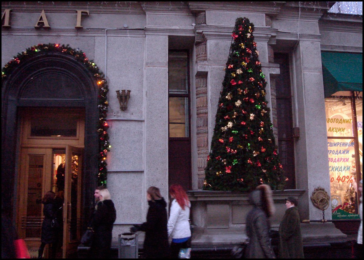 GENCIVE. Grand magasin d'État. L'entrée de GUM a été décorée de manière très traditionnelle - il y a des arbres de Noël sur les côtés. Comme toujours. Mais cela ne le rend pas moins beau. La tradition est toujours bonne. Côté vitrines ravies des bonhommes de neige et des coffrets cadeaux, mais les vitrines principales... GUM a été très intéressant en octobre, faisant une sorte d'excursion à travers les époques et modes, mais en hiver, il n'a malheureusement pas changé l'époque pour quelque chose de plus hivernal, mais a simplement ajouté des chapeaux, des écharpes et des arbres de Noël.