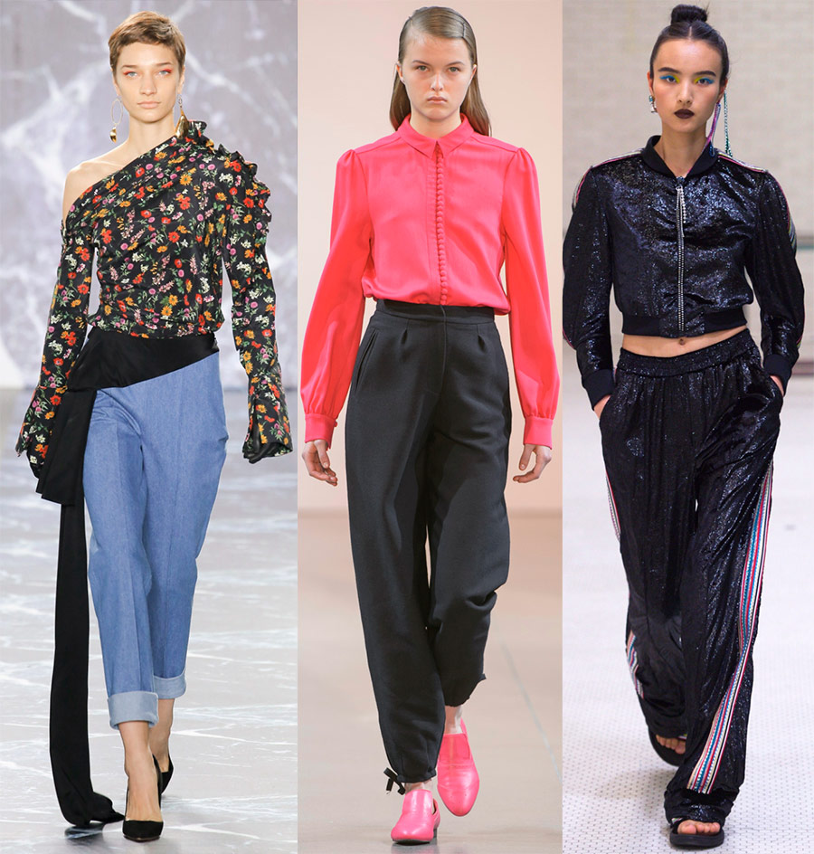 À maintes reprises, le pantalon à rayures est apparu sur le podium, qui est devenu encore plus élégant, un pantalon étroit avec des poignets en bas (seuls les poignets sont devenus plus soignés - la négligence a disparu), un pantalon ressemblant à un sarouel, dans lequel le bas est froncé sur un élastique bande ou cordon de serrage.