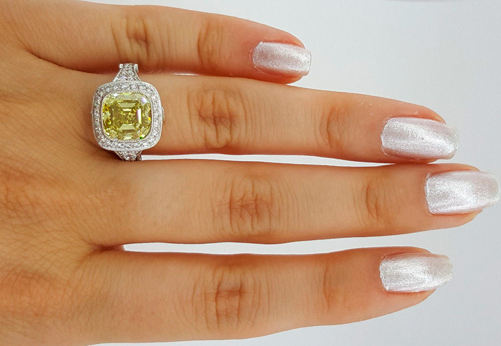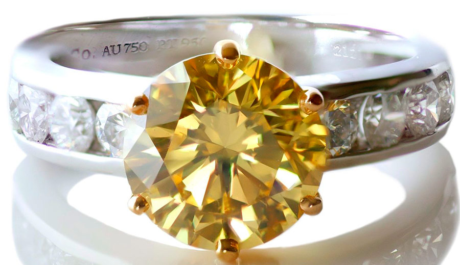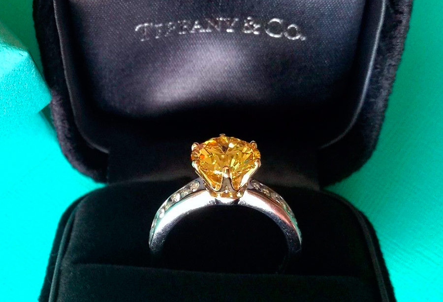 Pour les grosses pierres et surtout les jaunes, les bijoutiers choisissent l'or blanc ou le platine. Les pierres jaunes en or jaune sont extrêmement rares et souvent entourées d'autres diamants blancs, de sorte que les pierres précieuses ne se perdent pas sur le fond métallique. Vous devrez choisir - soit en or jaune avec de petits diamants blancs, soit en métal blanc avec des pierres jaunes.