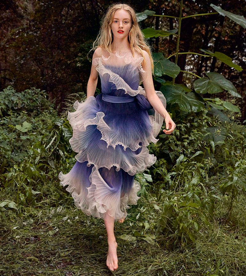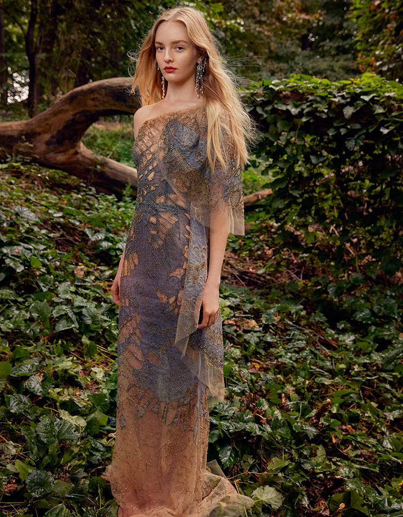 La nouvelle collection printemps-été 2026 est présentée sur fond de forêt, ce qui rend les images des modèles encore plus belles et fabuleuses. Les paysages forestiers évoquent des pensées de fées nymphes, de belles au bois dormant ou de princesses de la Renaissance.