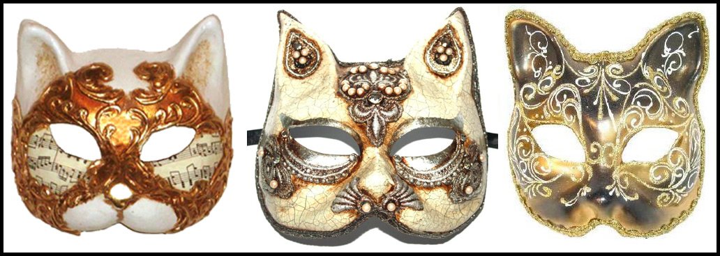 Chat. Ce masque de carnaval vénitien vient des chinois. Selon la légende, un Chinois est venu à Venise avec son chat.Il n'y avait pas de chats à Venise, mais il y avait assez de souris. Le chat a attrapé de nombreuses souris et pour cela le Doge (le souverain de Venise) a récompensé les Chinois. Le chat est resté vivre dans le Palais des Doges au cas où des souris apparaîtraient. Un Chinois satisfait est rentré dans son pays natal, où il a raconté ses aventures. Son histoire a été entendue par un deuxième Chinois qui a décidé de collecter des soieries et des objets de luxe, de les accompagner à Venise et de recevoir une récompense encore plus grande s'ils sont prêts à payer pour un chat ordinaire. Son voyage a été un succès et il a également reçu sa récompense des Vénitiens, ils ont donné la chose la plus précieuse qu'ils avaient - un chat. Grâce à cette histoire, le masque de chat est apparu.