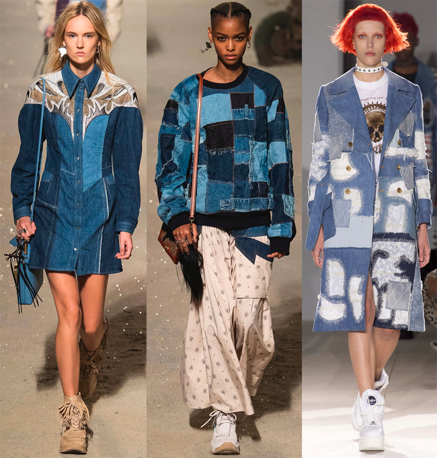 Parmi les nombreux modèles, on peut voir des jeans peints, avec des autocollants et des patchs, avec des patchs et des broderies, avec des éraflures et des taches délavées (comme le Tie Dye). Il y a du denim présenté dans la technique du patchwork. Les styles de robes en jean reprennent les tendances les plus en vogue.Et tout est en denim blanchi.