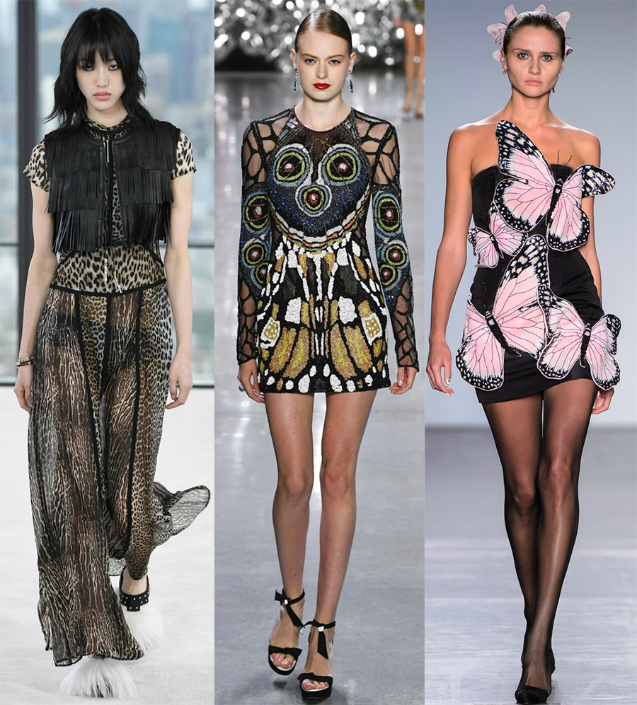 Ces empreintes restent. Parmi les animaux, les léopards et les reptiles sont particulièrement populaires. Des papillons voltigent sur les robes de Mary Katrantzou et de Zang Toi, et le créateur Naeem Khan a "aveuglé" ses modèles avec les ailes de papillons exotiques.