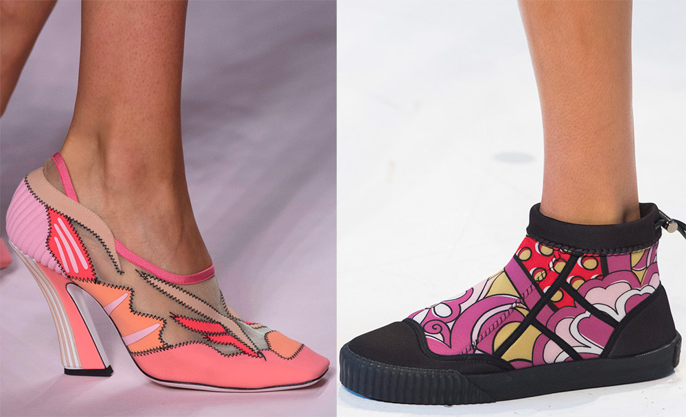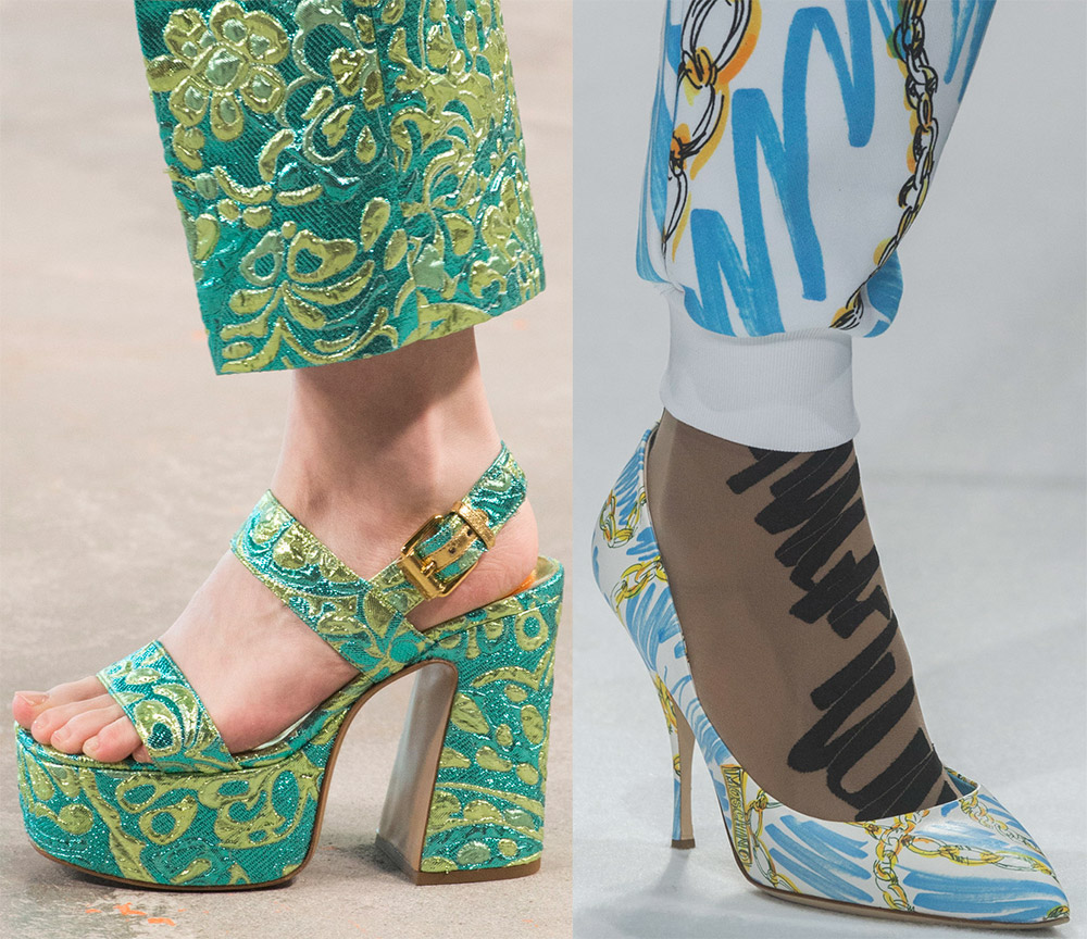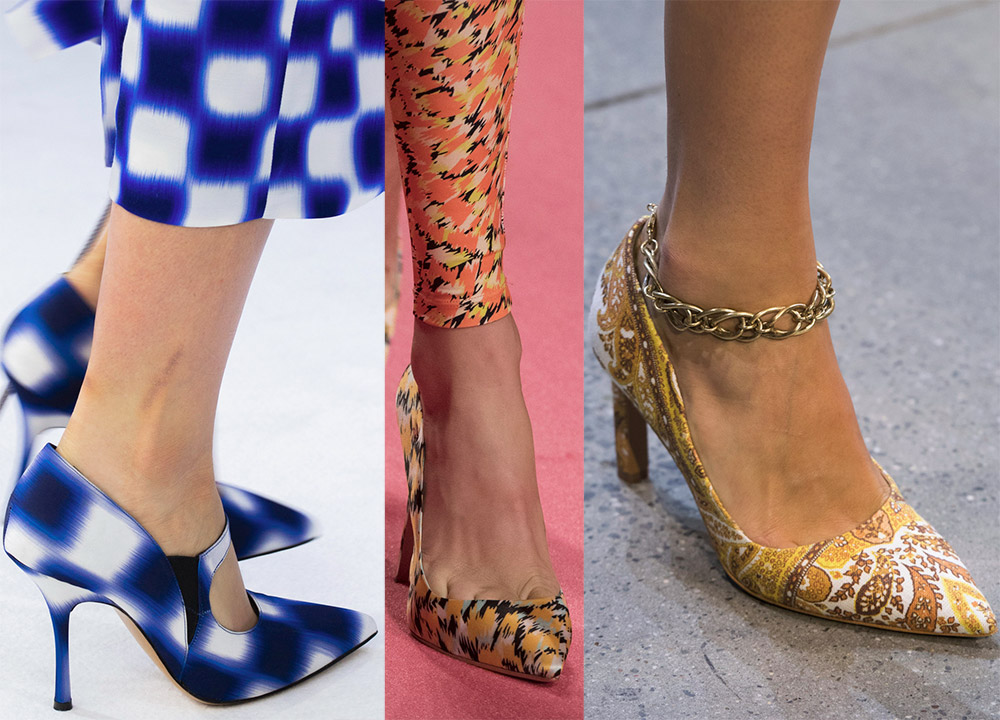Les chaussures imprimées occupent la place la plus importante dans les collections. Parfois, les motifs complexes des empreintes de chaussures correspondent aux empreintes des collants ou des vêtements. Et il est difficile de dire où finissent les chaussures et où commencent les collants. Des chaussures particulièrement colorées et peintes sont présentées par des créateurs de textiles, mais vous pouvez imprimer des images ou faire des inscriptions sur du cuir et sur tout autre matériau.