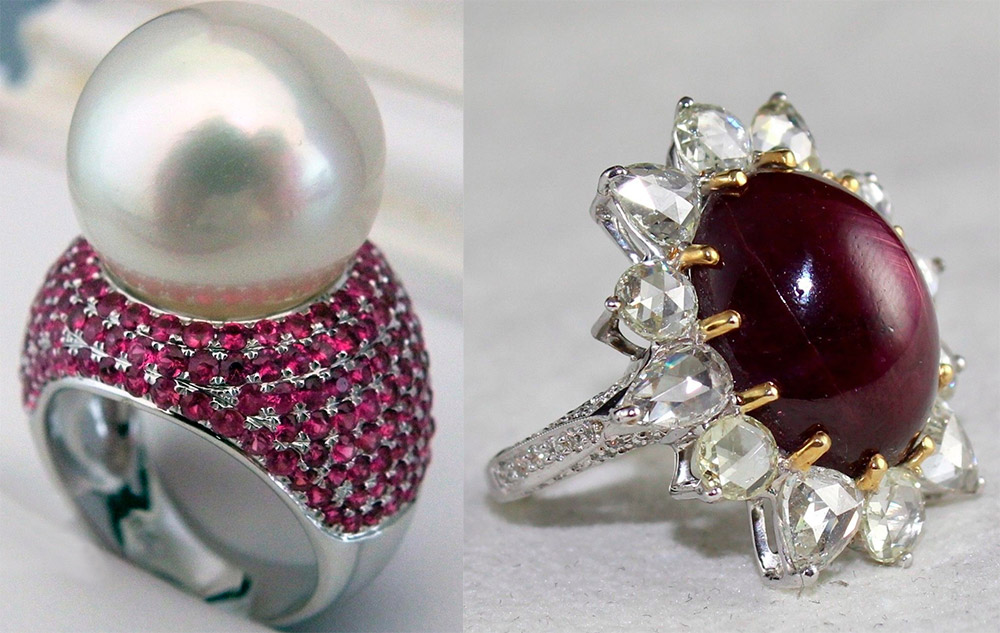 des rubis ornent le collier, bagues, bagues, bracelets, boucles d'oreilles et même montres. Les rubis dans les bijoux sont souvent combinés avec des diamants et l'or leur sert de cadre.