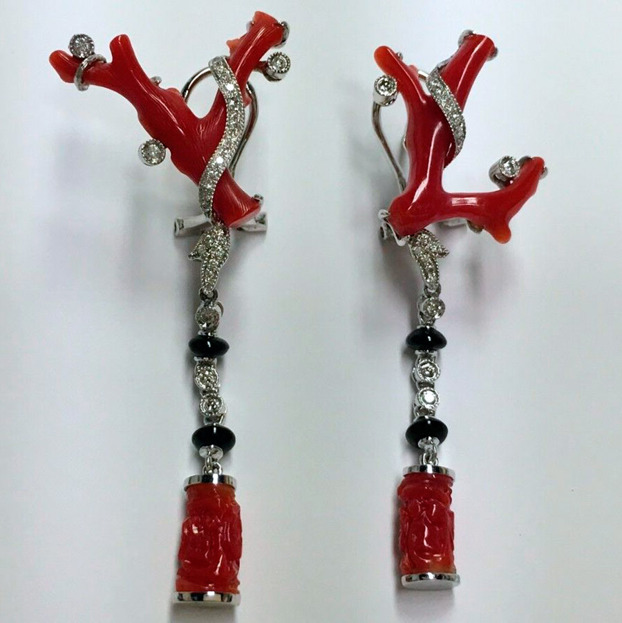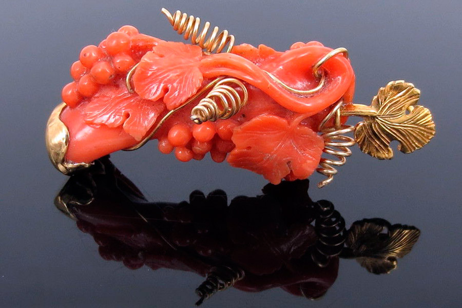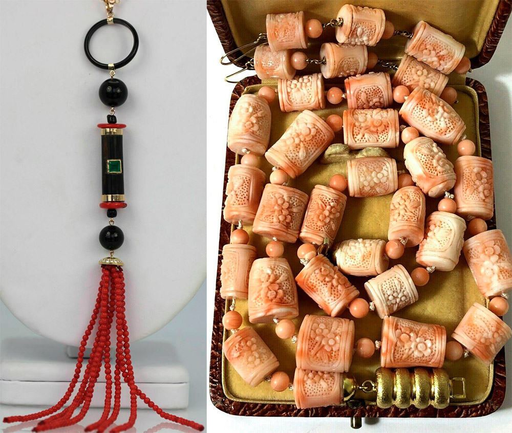 Les coraux sont placés dans un cadre noble - l'or et l'argent, combinés à des pierres semi-précieuses, les compositions à la grenade ou au rauchtopaze sont particulièrement belles. La beauté du matériau peut être transmise à l'aide de