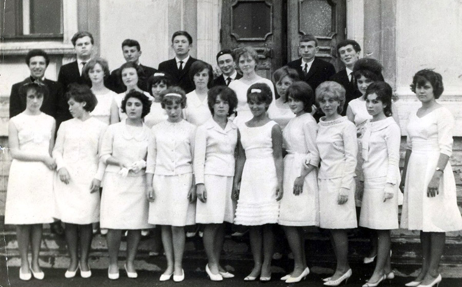 La situation est encore plus compliquée pour les femmes diplômées de l'ère soviétique. En URSS, l'idéologie du PCUS n'accueillait pas la passion pour la mode et le style, presque tout le monde vivait dans le besoin et n'avait pas le choix. La plupart des diplômés soviétiques avaient des tenues très modestes, certains se contentaient généralement d'uniformes scolaires et de nœuds blancs.
