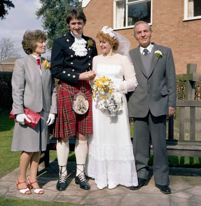 La mariée est banale, seule la robe est trop modeste selon les canons de beauté modernes. Mais le marié ressemble à un personnage de conte de fées des mondes fantastiques. A l'image du marié, tout est inhabituel - une jupe en kilt ornée d'un imprimé tartan et de boucles de ceinture. Chaussures - Richelieu écossais à talons bas avec entrelacs de fins lacets qui tressent les mi-bas...