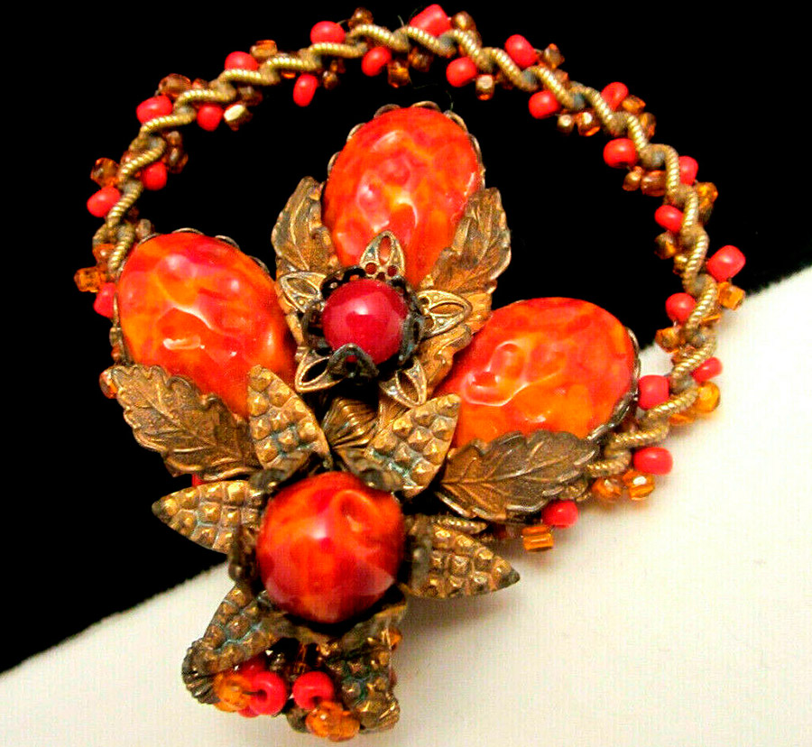 verre de Murano, perles tchèques, émail, produits dorés, et pendant la Seconde Guerre mondiale - plastique et bois. Bracelets, colliers et boucles d'oreilles étaient parfois réalisés dans un style héraldique, on pouvait même y lire des phrases latines.
