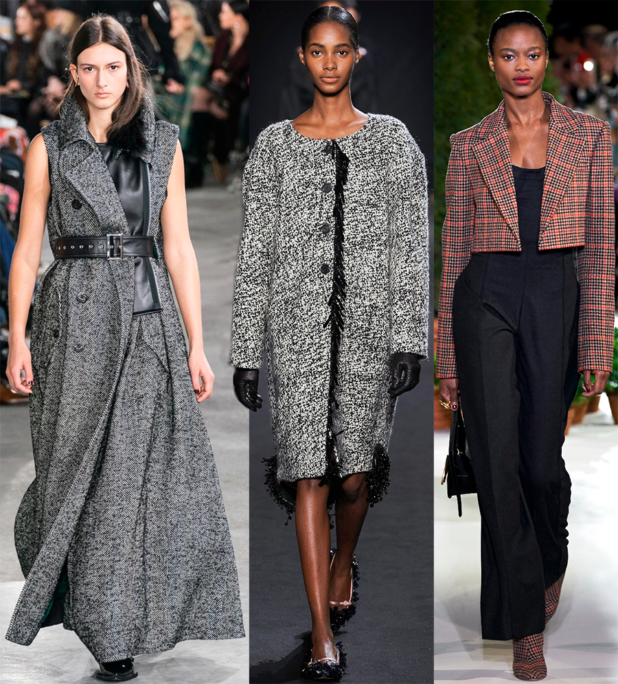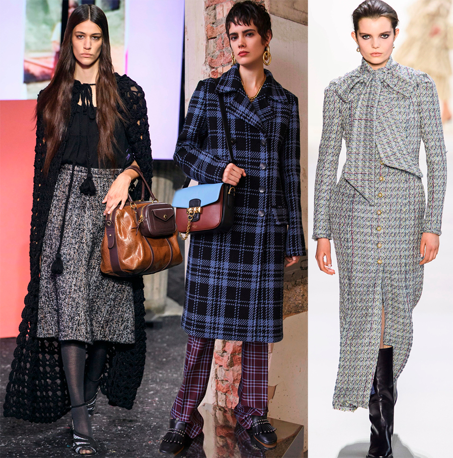 Une large sélection de modèles en tweed est proposée par les créateurs des collections Brock Collection, Dolce & Gabbana, Elisabetta Franchi, Givenchy, Miu Miu, Mulberry, Olivier Theyskens, Oscar de la Renta, Sacai, Stella McCartney, Versace, Victoria Beckham, et bien sûr, Chanel.