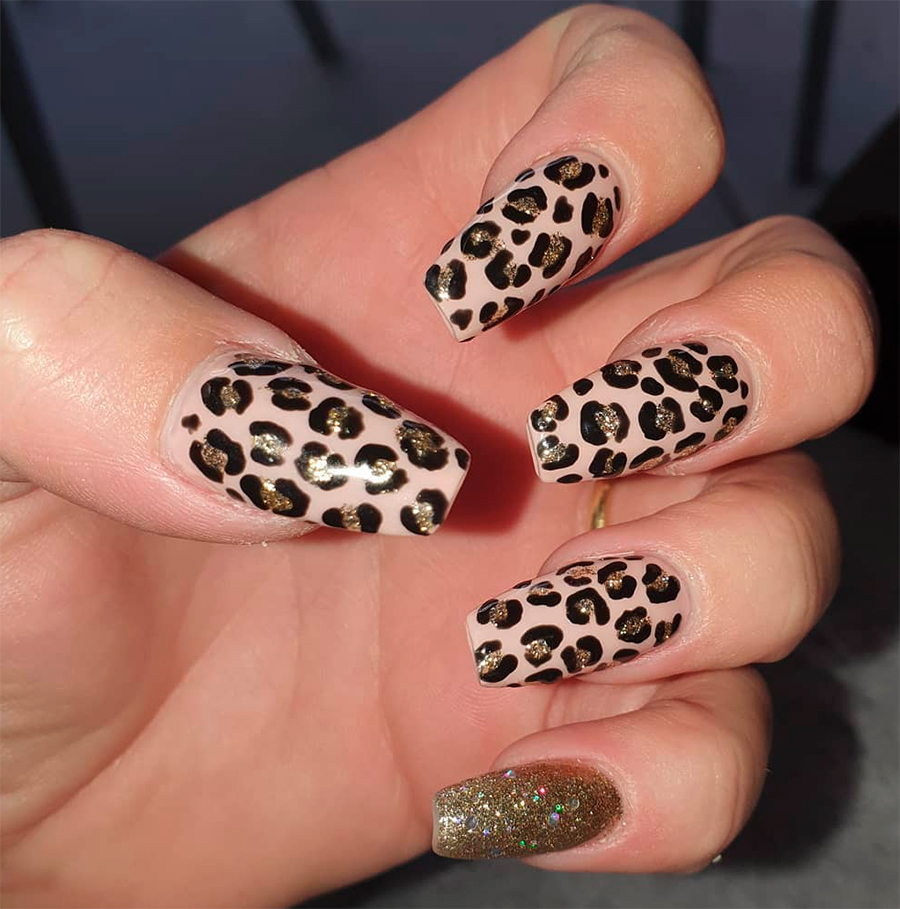 Vous pouvez compléter la manucure léopard avec un accessoire avec un imprimé associé. Des lunettes de la couleur d'un chat prédateur ou d'une ceinture seront une excellente continuation du thème prédateur.