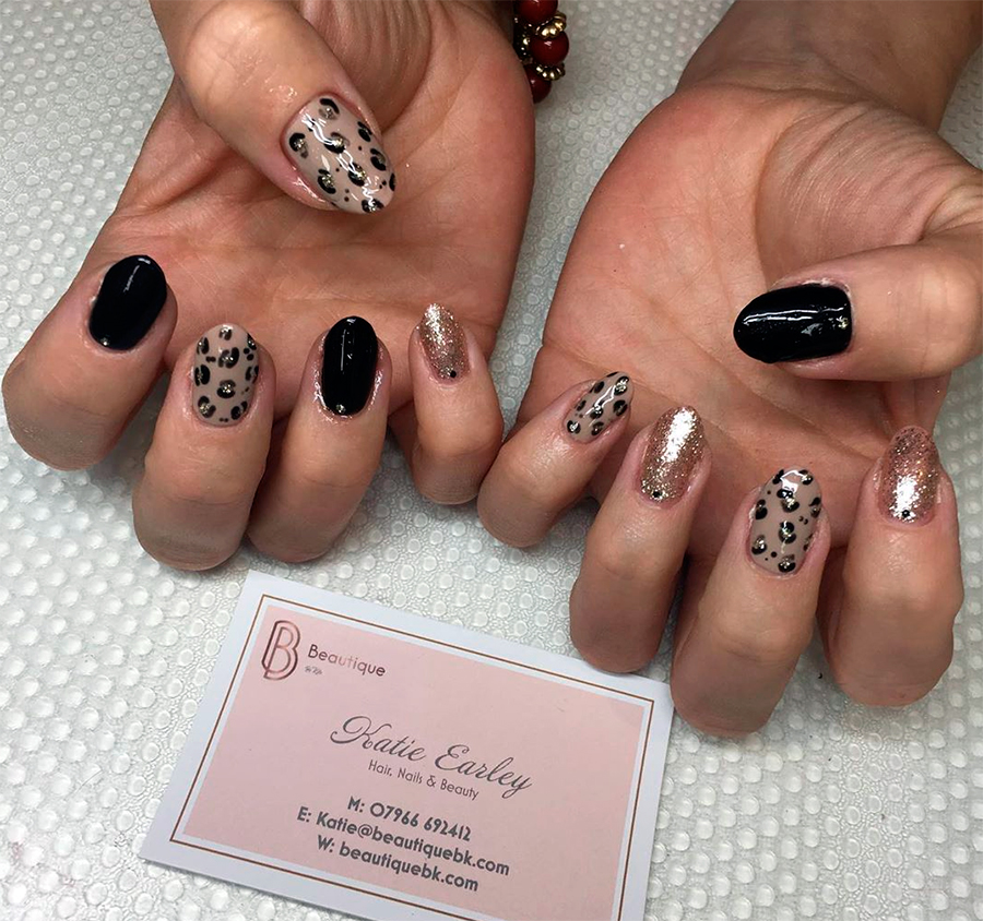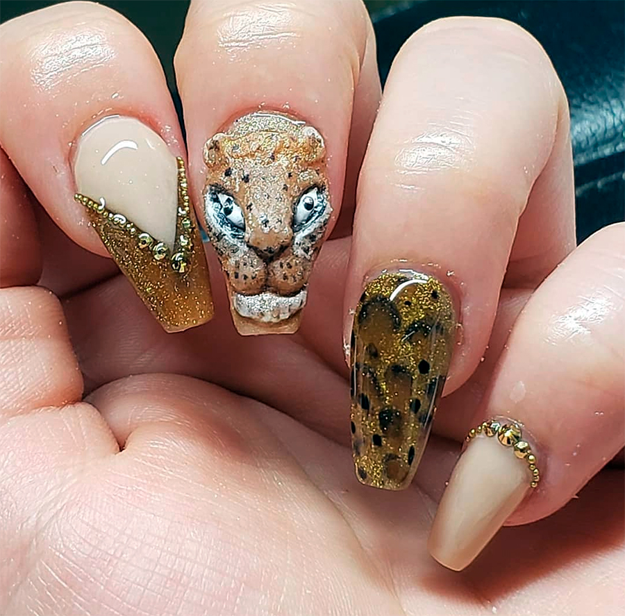 Pour une manucure, les couleurs d'un léopard et d'un guépard sont les plus adaptées. Le jaguar devra être fait sous une loupe à fort grossissement, en utilisant les pinceaux les plus fins. Dans les arts visuels, il y a un tel sens de la joaillerie, c'est lorsqu'un tableau est peint sur toile de la taille d'un timbre-poste. Dans notre cas, les toiles sont des clous.