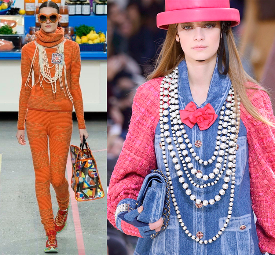 À notre époque, cette combinaison reste la norme de l'élégance raffinée, mais pour de nombreuses fashionistas, elle semble trop ennuyeuse. Les tendances de la mode de notre époque permettent une combinaison de 3 à 4 nuances ou plus à la fois, et l'asymétrie est toujours d'actualité, grâce à laquelle de nombreux créateurs choisissent des perles de forme complexe et irrégulière, ce qu'on appelle le baroque.
