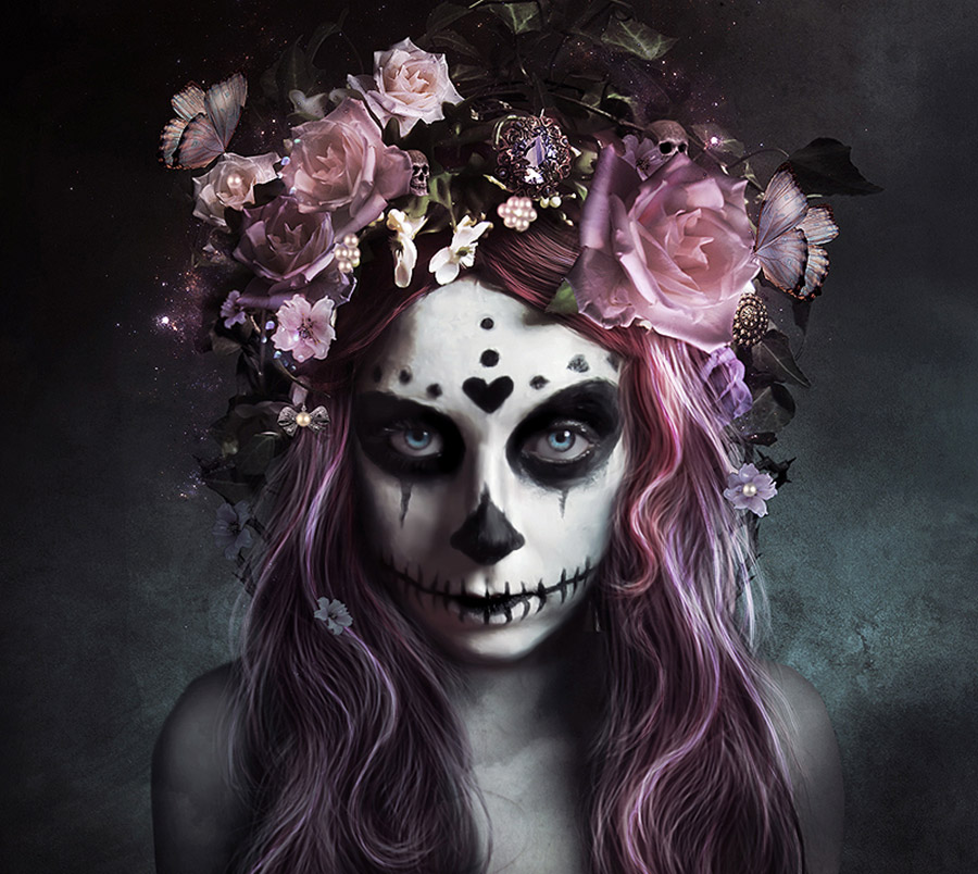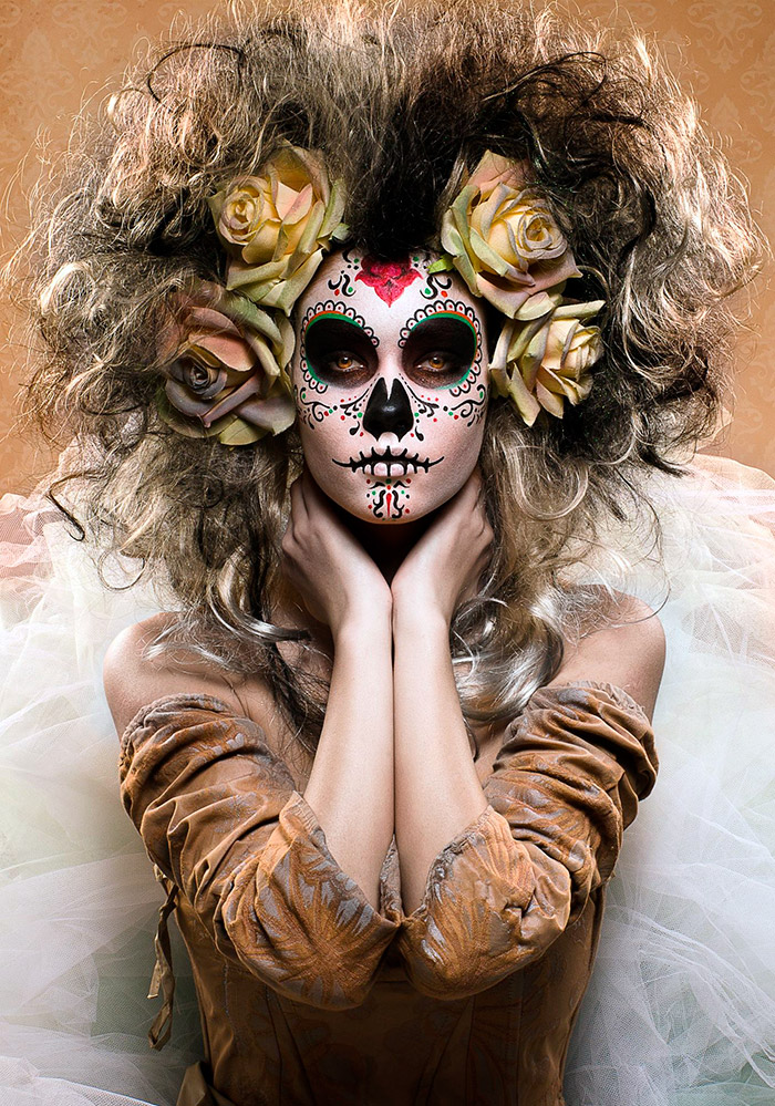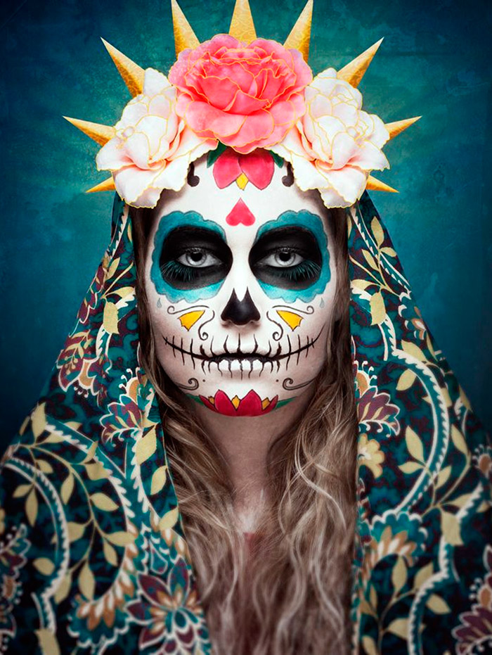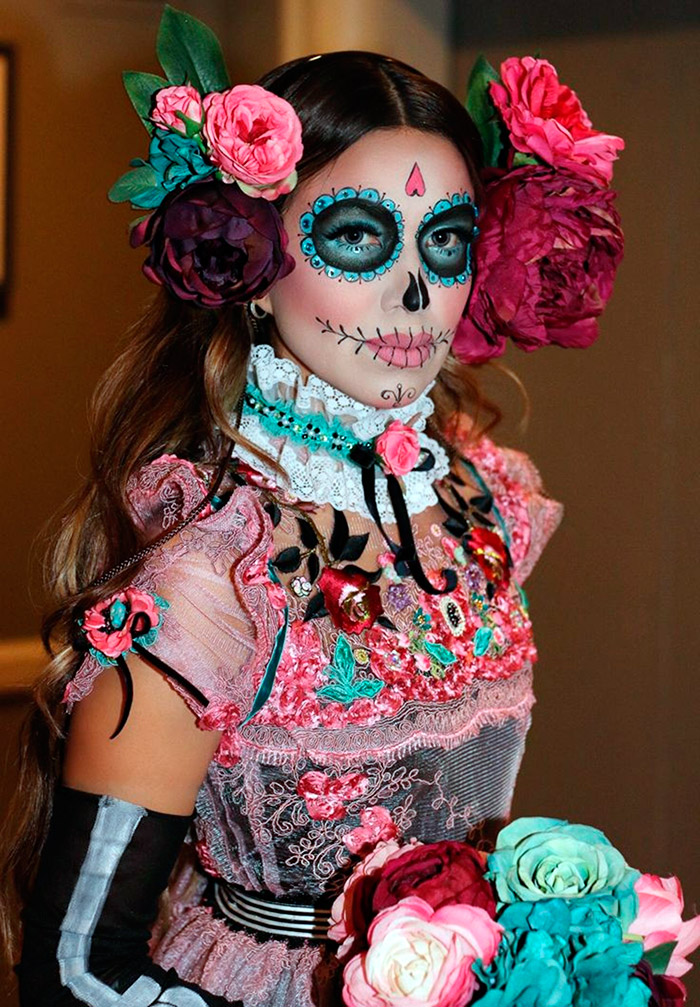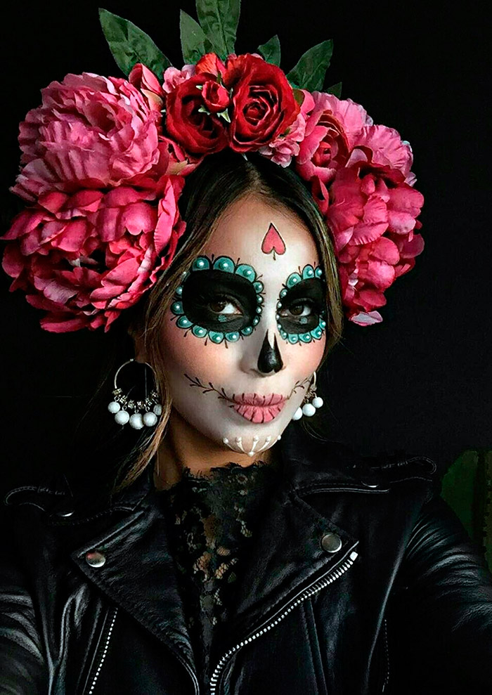 Idéalement, faites d'abord une base blanche, puis utilisez des traits noirs et toutes les couleurs disponibles dans la trousse de maquillage. Les couleurs rouge, verte, bleue et rose ajouteront des vacances à l'image et les ornements floraux rendront le masque Calavera plus mignon et délicat. Vous pouvez compléter le look avec des roses vivantes en décorant un serre-tête ou un diadème avec des fleurs.