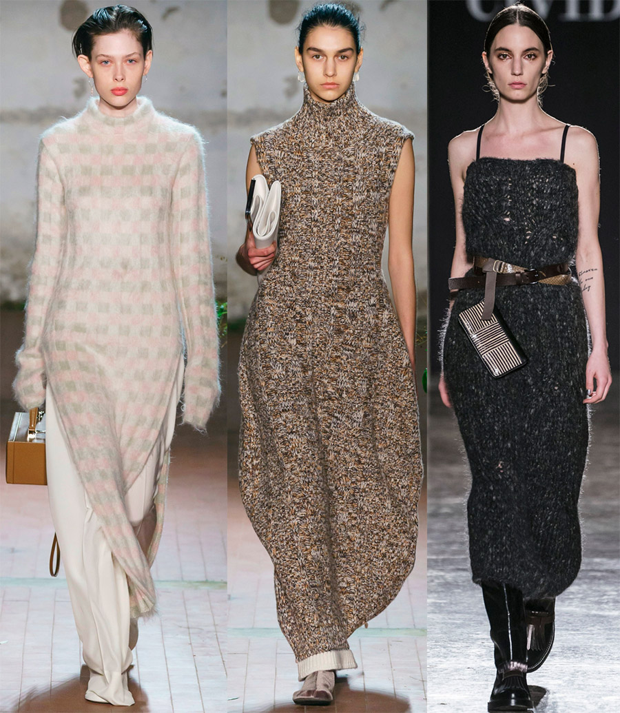 ASAI, Laura Biagiotti, ThéorieDans les collections de la saison automne-hiver, les créateurs proposent des robes en maille associées à des matières de texture différente. Si vous combinez des parties tricotées du produit avec un matériau de texture plus légère, vous pouvez créer une imitation de superposition. Cette option répondra aux tendances à la mode - asymétrie, superposition et déconstructivisme, et en même temps ne créera pas de volumes inutiles.