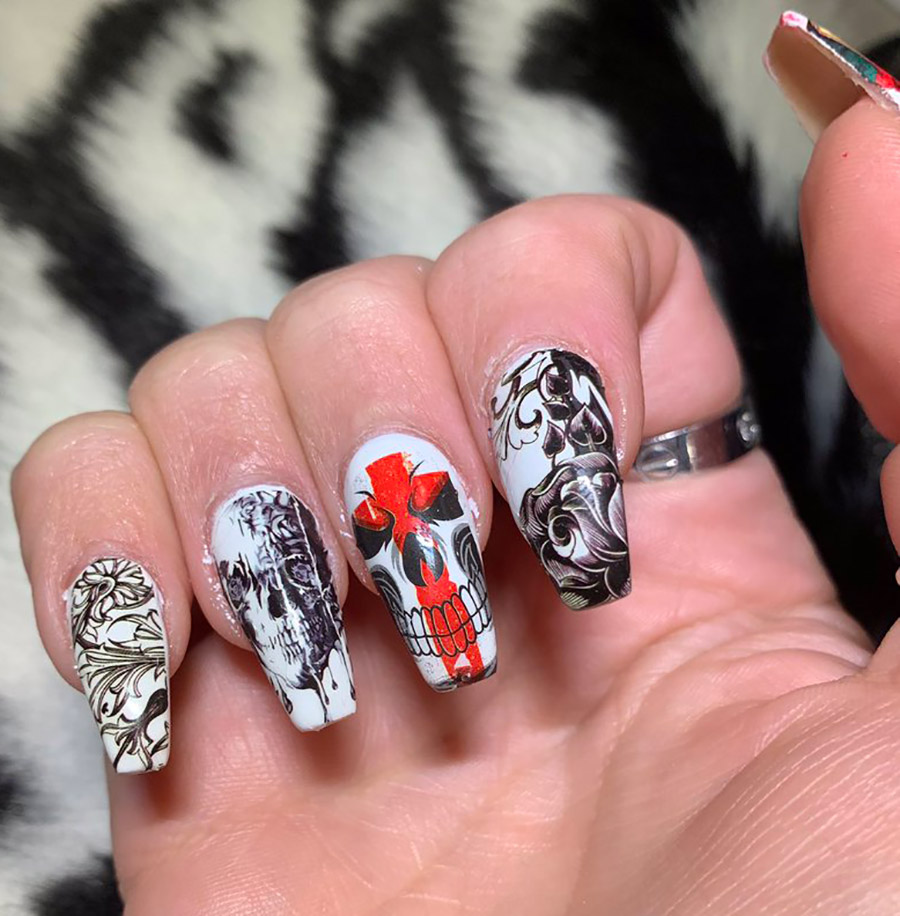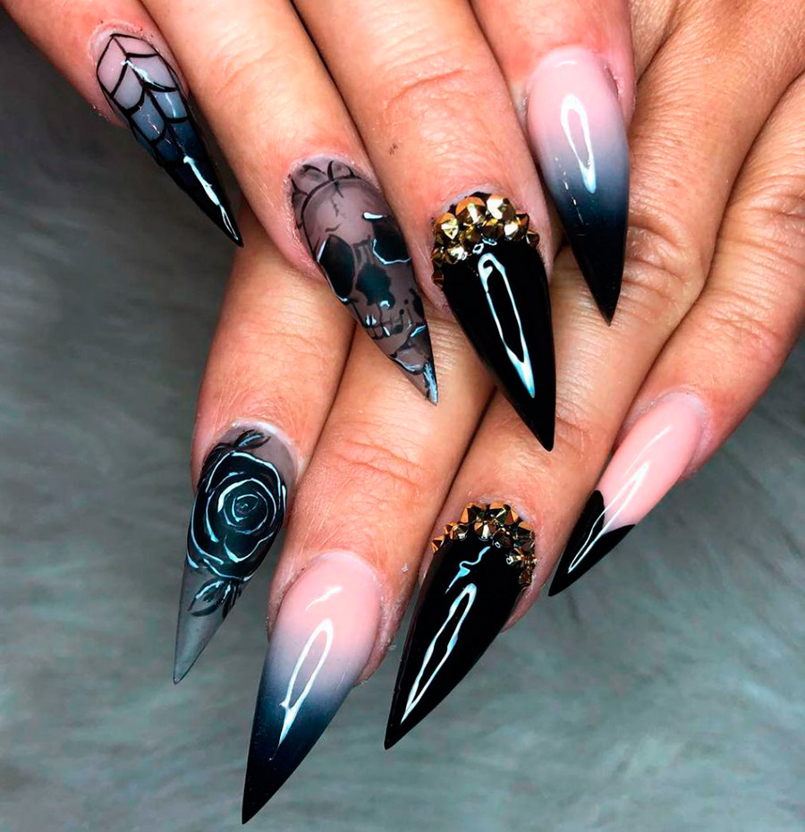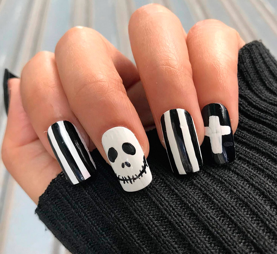 Il n'est pas nécessaire de dessiner des crânes, vous pouvez dessiner des fils minces d'une toile d'araignée, cette conception d'ongle s'adaptera à presque toutes les images, l'essentiel est que les mains et les ongles soient parfaitement soignés.