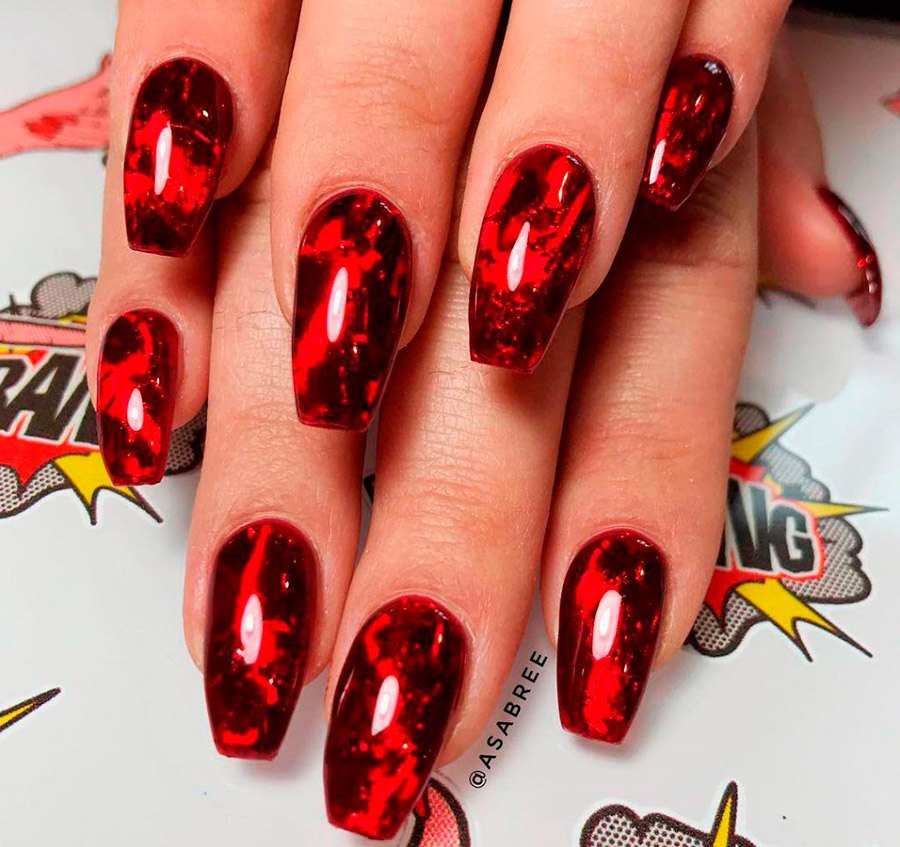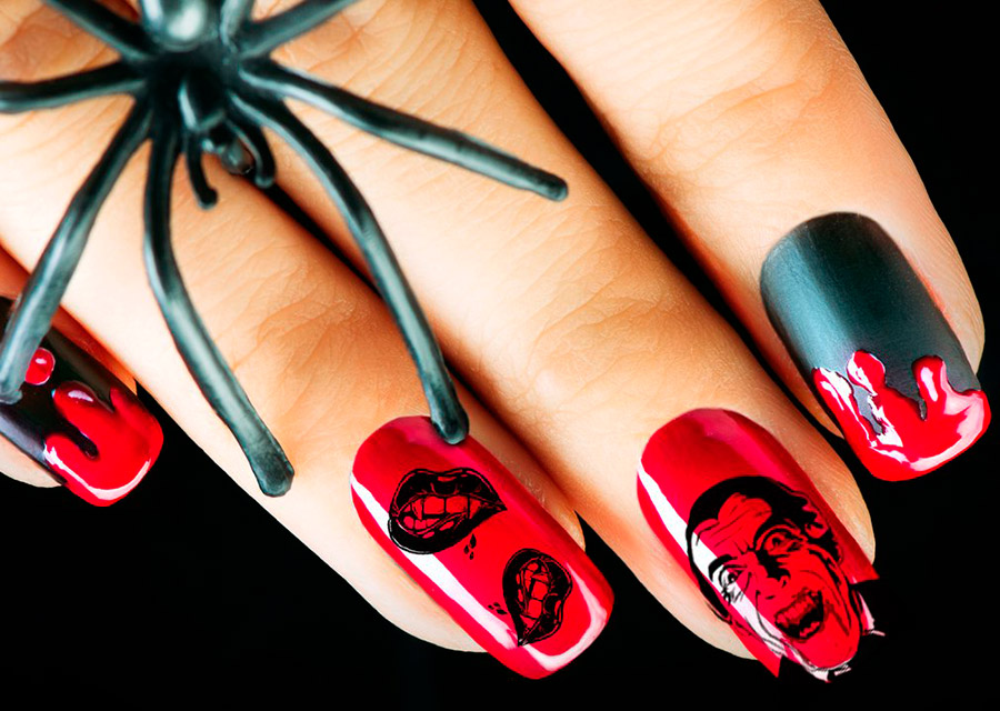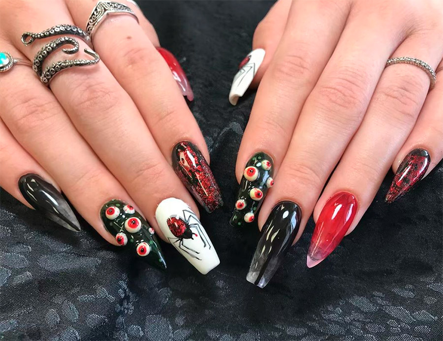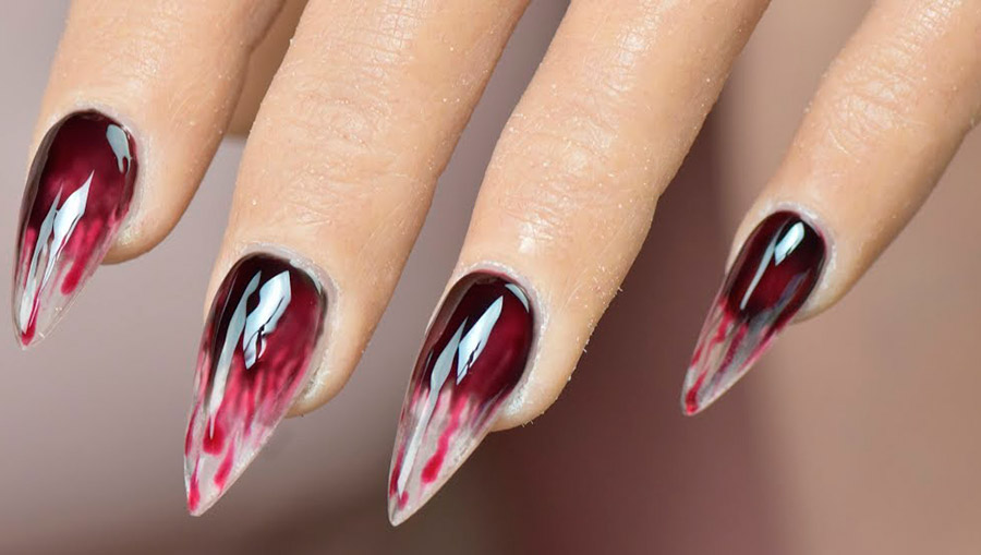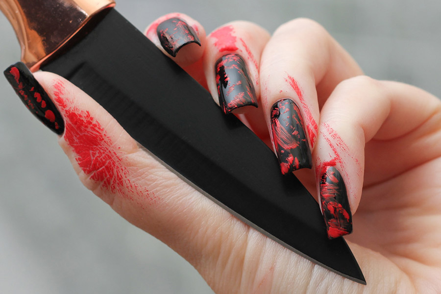 Les looks les plus effrayants et les plus agressifs nécessiteront plus de vernis. Rappelez-vous les films d'horreur, à quoi ressemblent les mains de zombies ? Ils sont couverts de sang ! Nous pouvons coller des ongles cassés et grignotés, les peindre avec désinvolture avec du vernis rouge et appliquer différentes nuances de vernis sur nos doigts pour obtenir un effet complètement laid.
