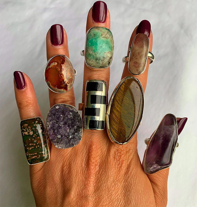 Les principaux matériaux du design classique sont l'argent, le cuivre et le bronze, mais l'or et le platine ne seront pas non plus superflus, surtout si ces bagues sont composées de grosses pierres naturelles. Les beautés bohèmes adorent les pierres naturelles dans les bagues, les bracelets et les colliers. Seulement aujourd'hui, nos amis asiatiques réussissent si bien à créer des pierres artificielles que vous ne pouvez pas trop forcer. De beaux bijoux faits de pierres d'imitation viendront également compléter notre look.