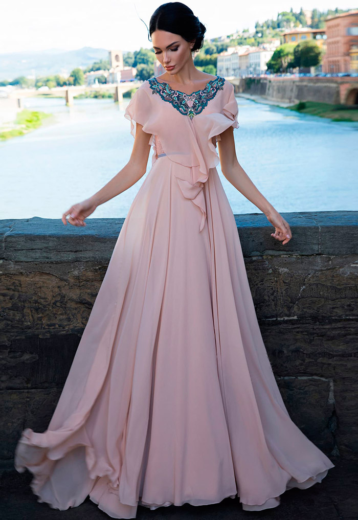 • La coupe droite est élégante et sobre, mais la couleur rose lui donne de l'originalité, et le décor sous forme de broderies volumétriques ou de motifs chatoyants - solennité ;