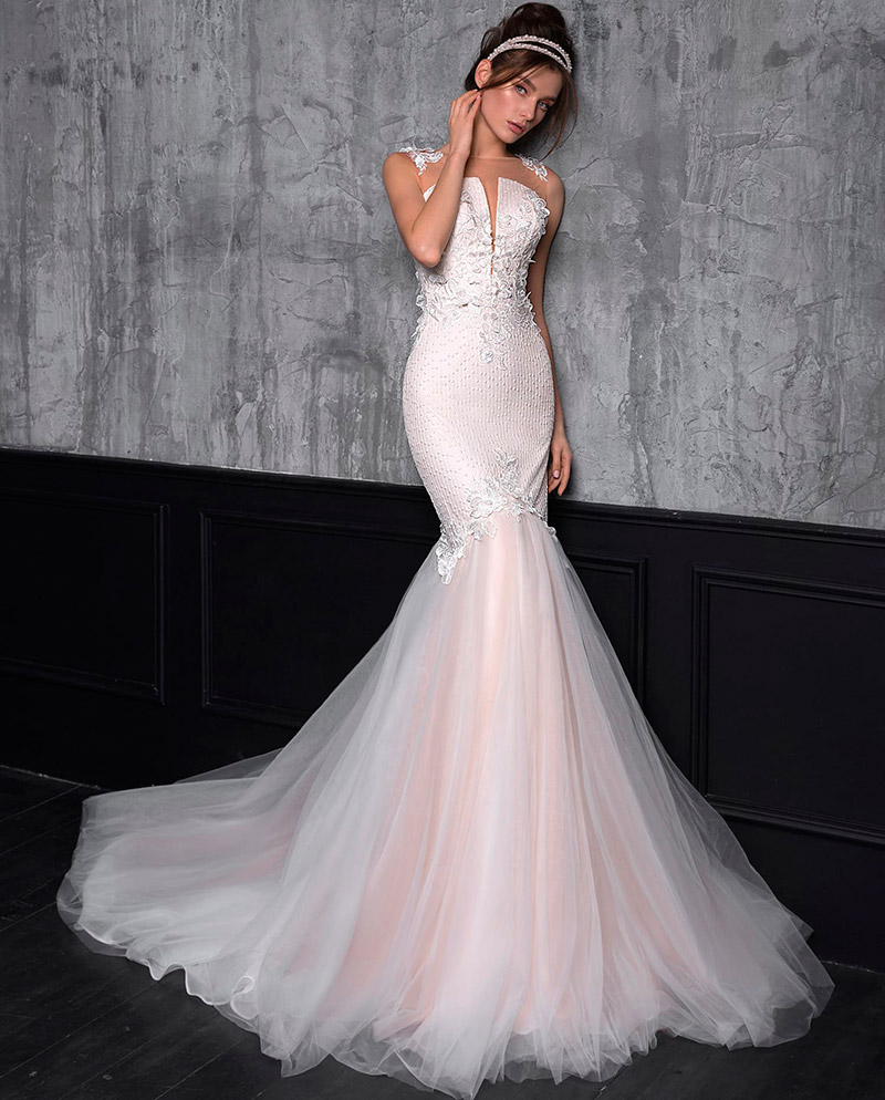 • Le rose confère à la coupe sensuelle de la sirène un charme particulier et l'utilisation de différentes textures de tissus rend l'image expressive. Une mariée dans une telle tenue, alliant la tendresse de la couleur et la séduction de la coupe, aura l'air irrésistible.