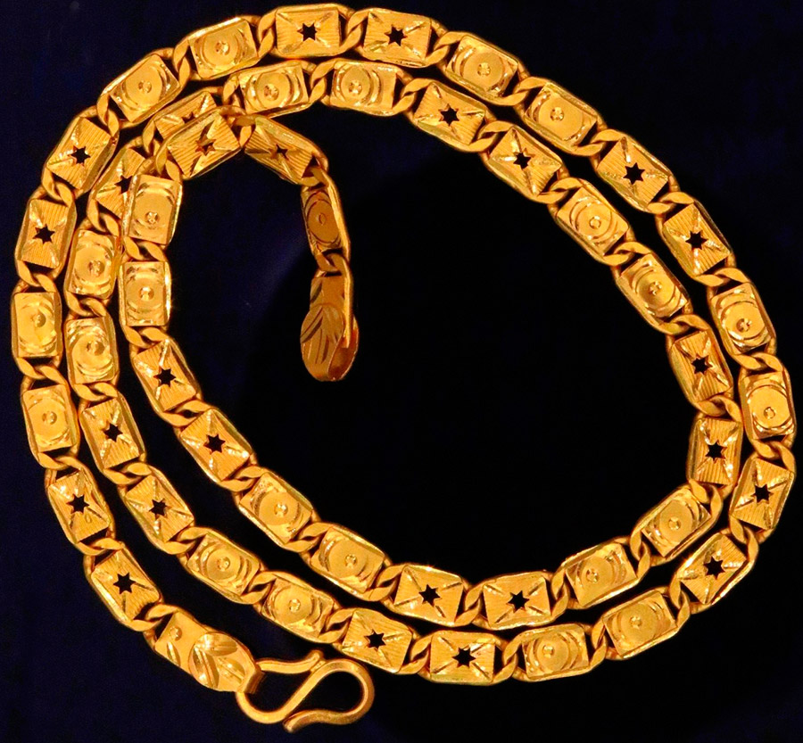 L'épaisseur moyenne d'une chaîne d'homme est d'environ 4 à 6 mm. La longueur de la chaîne dépend des préférences individuelles, ainsi que de la hauteur et de la constitution. Beaucoup d'hommes choisissent une chaîne qui repose librement à la base de leur cou et qui est visible sous le col ouvert de leur chemise. Si un homme est de corpulence moyenne, la longueur minimale d'une telle chaîne ne dépassera pas 50-55 cm.