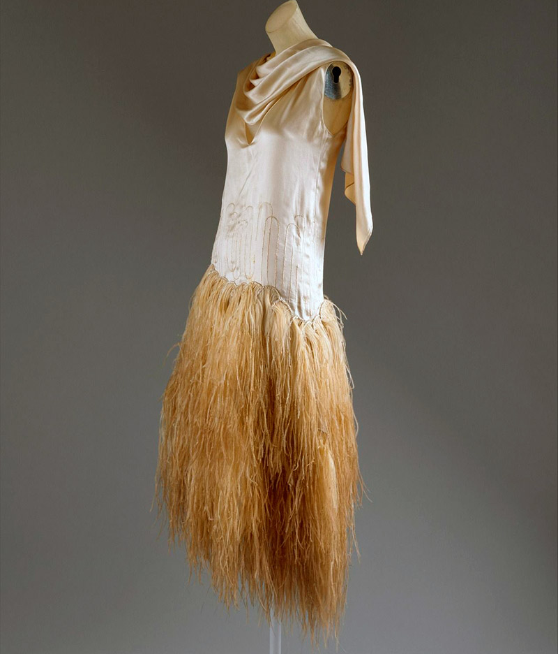 Madeleine Vionne a commencé à utiliser les idées de l'art contemporain.C'est ainsi qu'une robe en forme de "cage en damier" a été créée, dans laquelle les cages ont été découpées dans des tissus d'argent et d'or. Elle est également restée fidèle à sa coupe oblique. La créatrice a orné la robe d'une silhouette droite, coupée dans le biais, d'une longue frange de la même couleur, cousue le long des fils partagés, ce qui a permis de créer une silhouette nette.