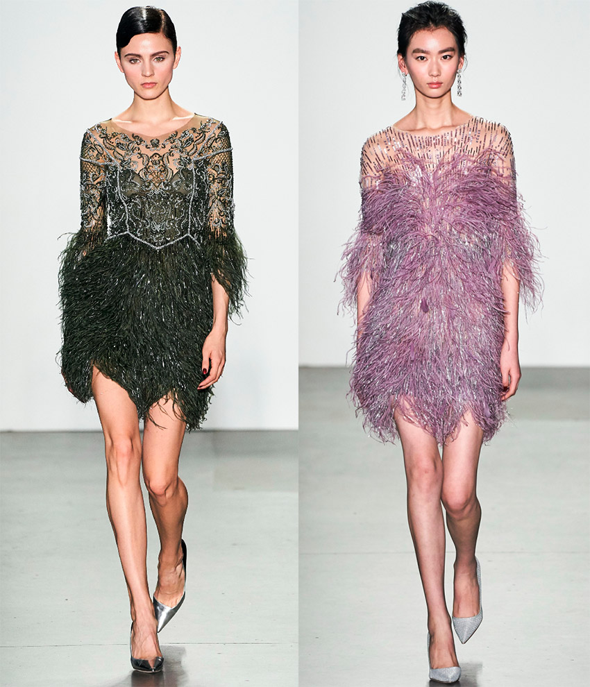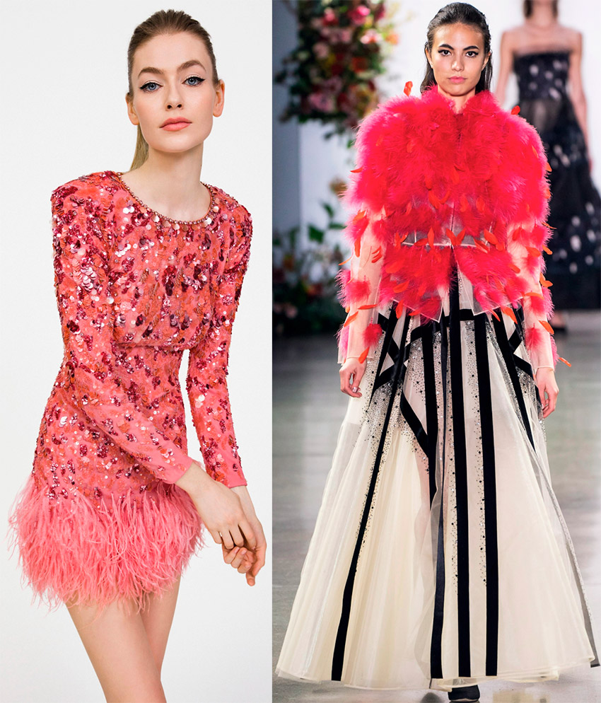 Mary Katrantzou, Naeem KhanCeux qui se soucient de la vie de la flore et de la faune sur Terre n'ont pas à se soucier des oiseaux, aujourd'hui l'idée de plumes synthétiques est activement promue, qui décorent les vêtements aussi colorés que les naturels, mais ne nécessitent pas de soins complexes.