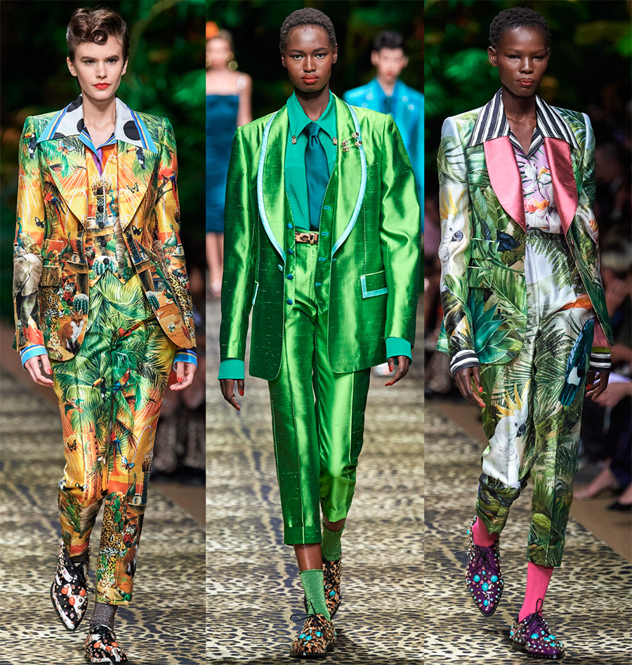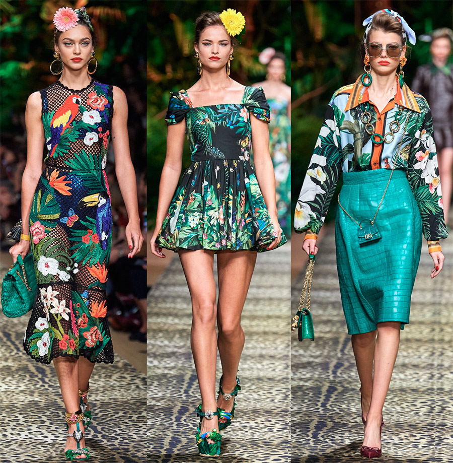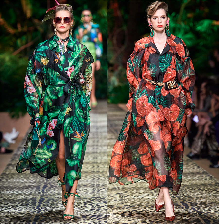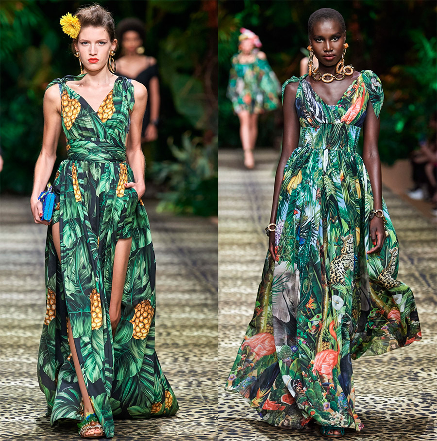 1. Robes luxueuses de style tropicalrichement décoré d'imprimés, de broderies et de dentelles sera très pertinent dans la saison chaude de 2026. Le thème tropical peut être retracé tout au long de la collection. En plus des imprimés avec des plantes, des fleurs et des oiseaux, faisons attention aux vêtements unis à franges, par exemple une robe verte et une veste, ils aideront, comme un costume de camouflage, à se fondre dans la forêt tropicale.