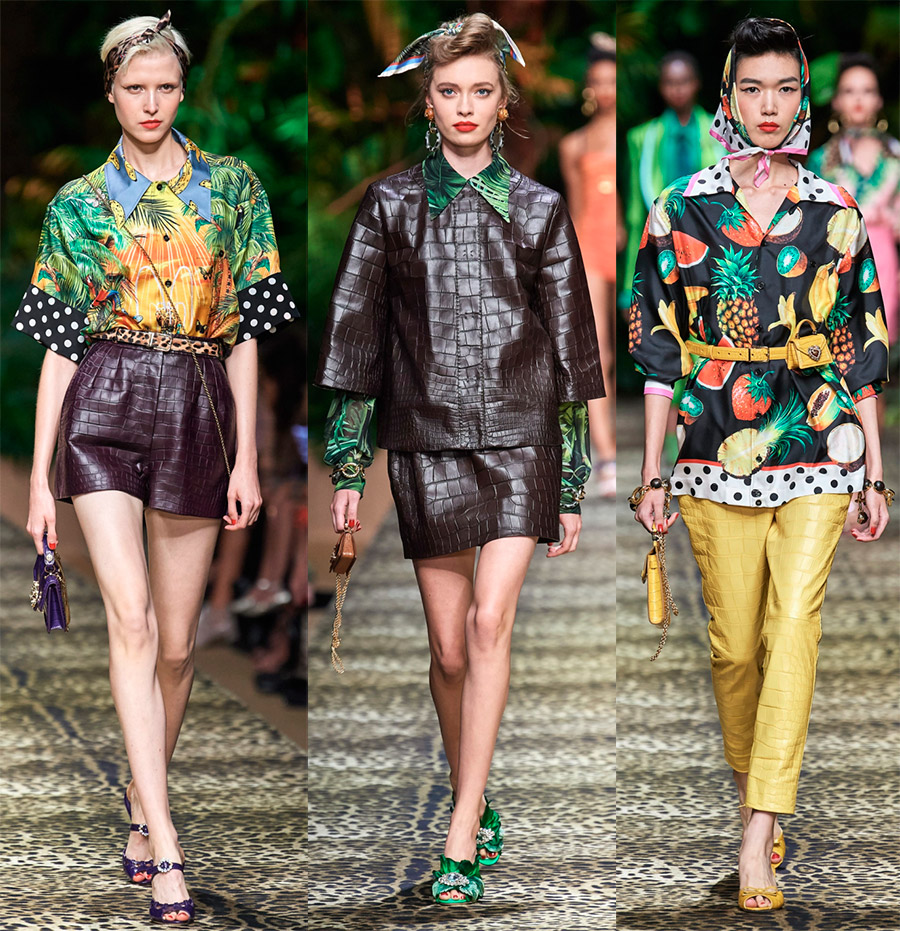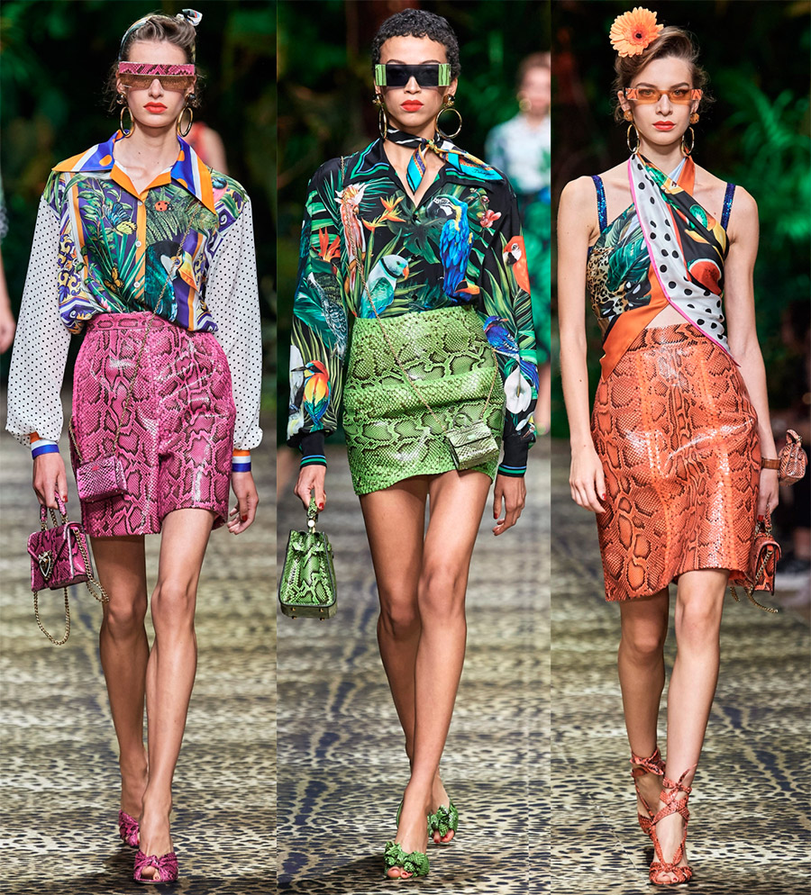 3. Serpent. En plus des impressions sur tissu, faites attention aux jupes en cuir, aux sacs à main et aux chaussures d'été pour femmes. En 2026, comme auparavant, la peau de python et autres reptiles ne perd pas en popularité. Dolce & Gabbana propose un thème de serpent dans différentes nuances, mais tous les ensembles sont lumineux, ce qui est particulièrement vrai pour les mois les plus chauds.