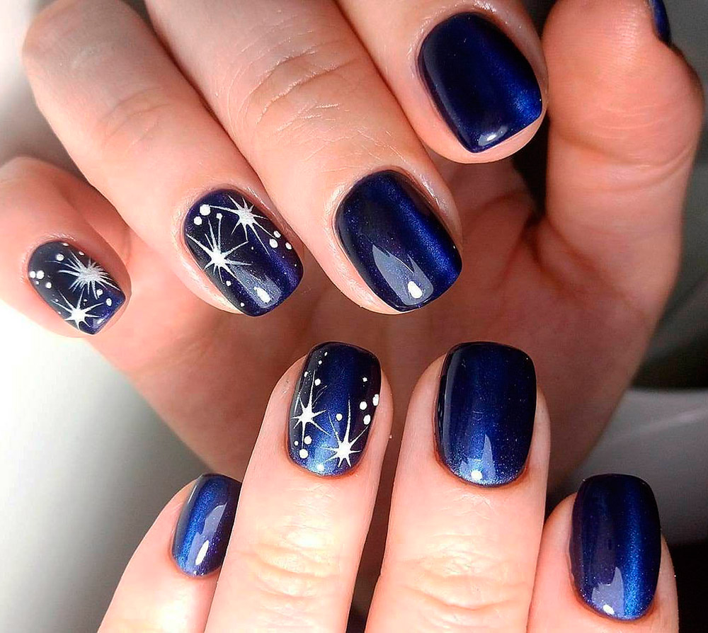 La laque noire ou bleu foncé sera décorée de dessins de constellations et de petits strass. Des paillettes et des autocollants assortis peuvent être utilisés. De tels ongles ne passeront pas inaperçus, ils sont à la fois étincelants et loin d'être frivoles, car le ciel étoilé fait penser à l'éternité et à l'infini.Une telle manucure donne même du sérieux, il suffit de se rappeler un peu d'astronomie et, à l'occasion, de raconter quelque chose d'intelligent sur l'exploration spatiale moderne.