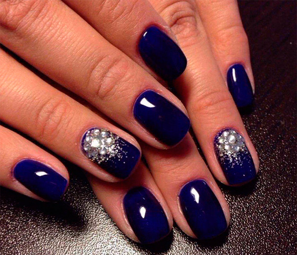 N'importe quel jour d'hiver, les strass seront une excellente décoration pour les ongles. Des cristaux blancs étincelants de strass, comme des morceaux de glace miniatures, scintillent sur les ongles et donnent à l'image une lueur froide