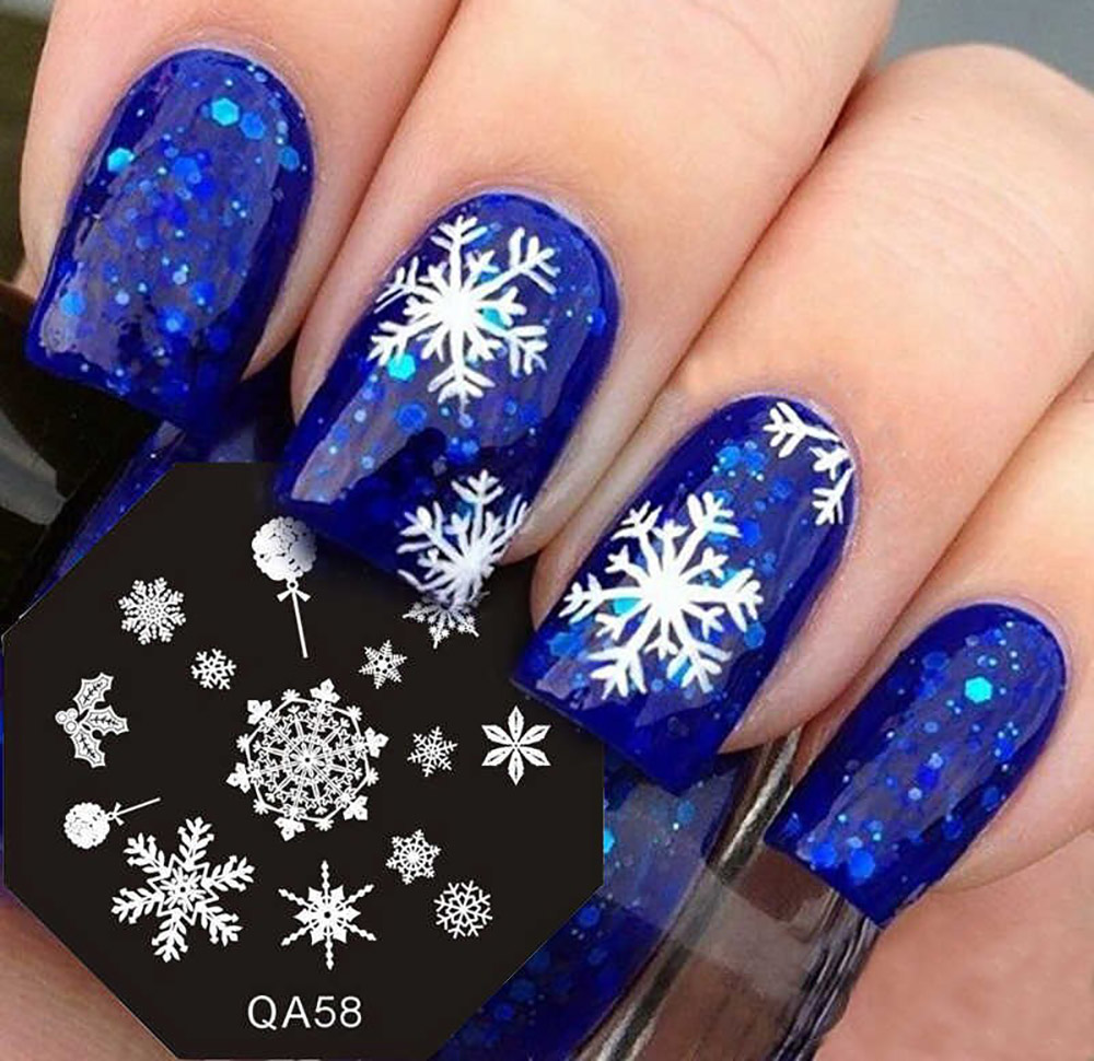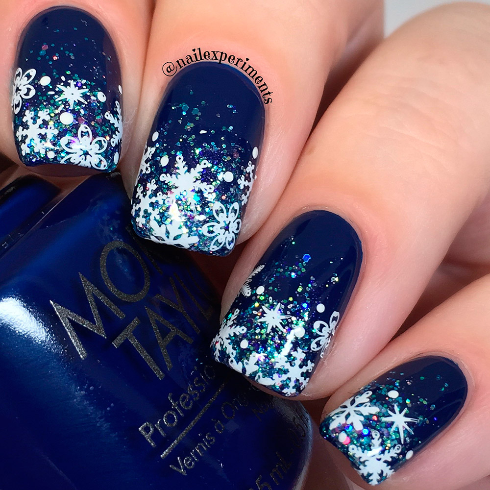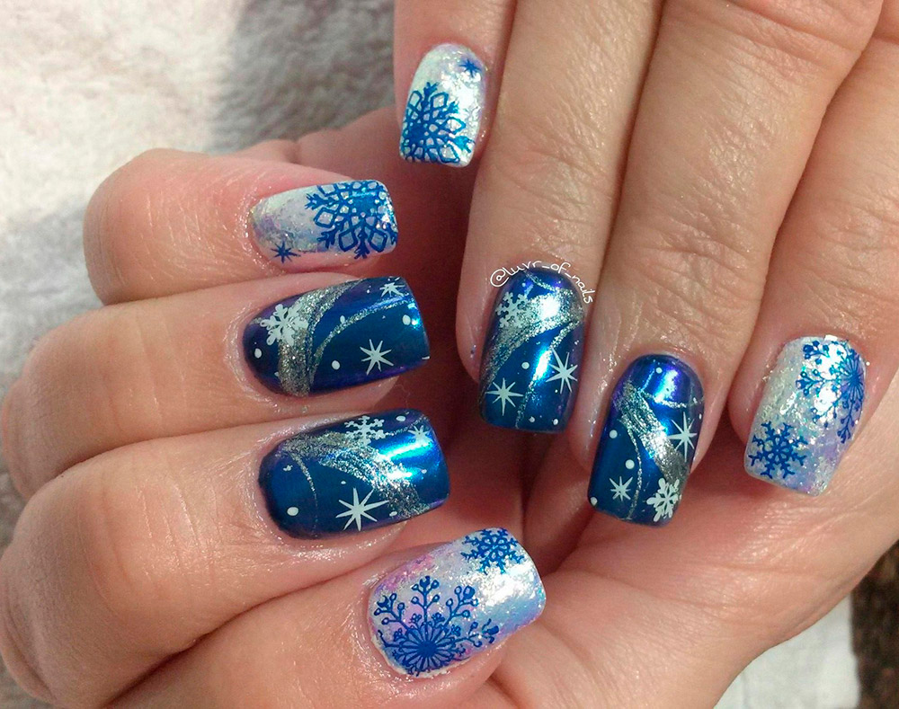 Manucure d'hiver avec motifs de glace et flocons de neige