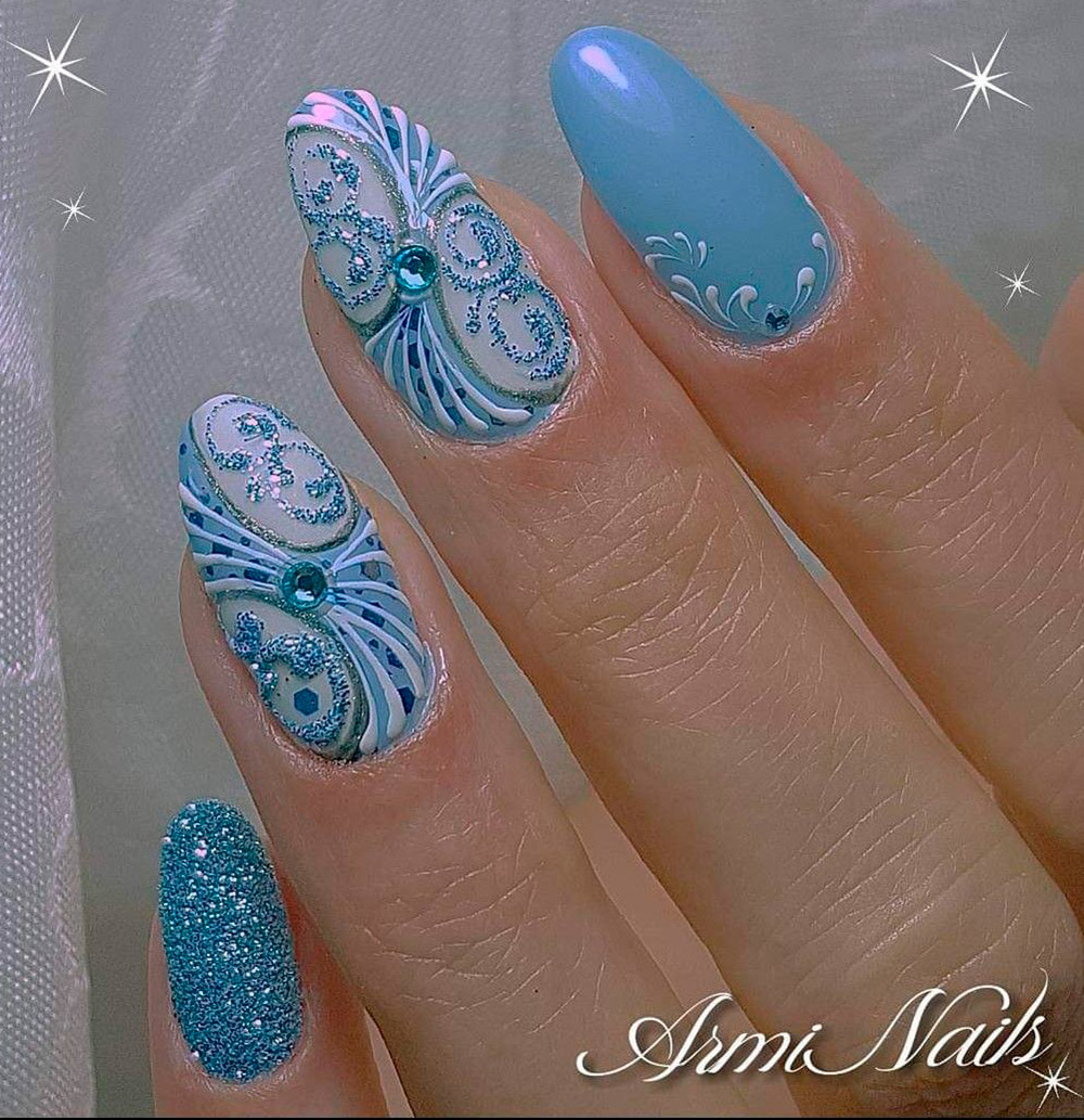 Pour créer une manucure des neiges, les vernis en blanc, bleu et bleu sont idéaux. En plus des teintes hivernales, les paillettes et les strass sont parfaits pour décorer les ongles. Vous pouvez utiliser différentes nuances de paillettes et de strass, mais il est préférable de choisir celles qui sont le plus hivernales - l'argent, alors tout sera aussi harmonieux que possible.