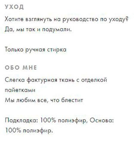 Vérifiez toujours la composition. Surtout si vous êtes allergique à tel ou tel matériau. Le meilleur ratio dans la composition des vêtements est de 60 à 70 % de fibres naturelles et de 30 à 40 % de fibres synthétiques. De tels vêtements garderont leur apparence beaucoup plus longtemps.