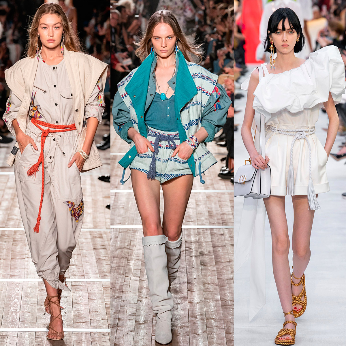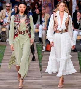 Dans les années 60, Yves Saint Laurent crée une collection aux allures de safari. Aujourd'hui, il est à nouveau d'actualité, l'esprit de liberté et d'aventure s'y ressent. Et les principaux éléments décoratifs seront de larges ceintures en cuir, bien que des ceintures en corde soient également utilisées, ainsi que des bretelles et, bien sûr, de grandes poches spacieuses.