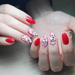 Le rouge est la couleur traditionnelle du 14 février. Robes rouges, imprimés rouge vif sur tissu, lèvres rouges et, bien sûr, ongles rouges. En général, la couleur écarlate classique est déjà devenue la couleur de base de la manucure de tous les jours. Lui, comme une veste, aux couleurs nude, blanche ou noire, s'adapte à tout style vestimentaire et à toute situation. Et le jour de la Saint-Valentin, la laque rouge bat des records de popularité !