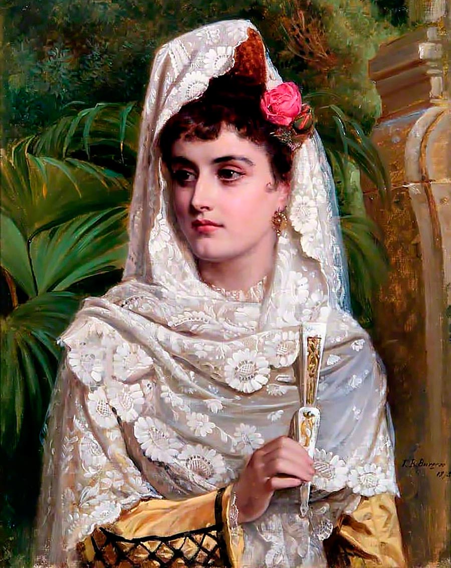 Parmi tous les grands artistes, je voudrais citer l'artiste anglais John Bagnold Burgess (1829-1897), pour qui l'Espagne est devenue le thème principal de son œuvre. Ayant visité l'Espagne pour la première fois en 1858, il y revient constamment, visitant chaque année pendant 30 ans.Il a consacré sa vie à étudier le pays, son mode de vie et son caractère national, incarnant des thèmes espagnols et tziganes sur ses toiles. Dans ces peintures, on peut souvent voir des femmes à haute crête, portant une mantille de dentelle noire qui met en valeur le marbre du corps.